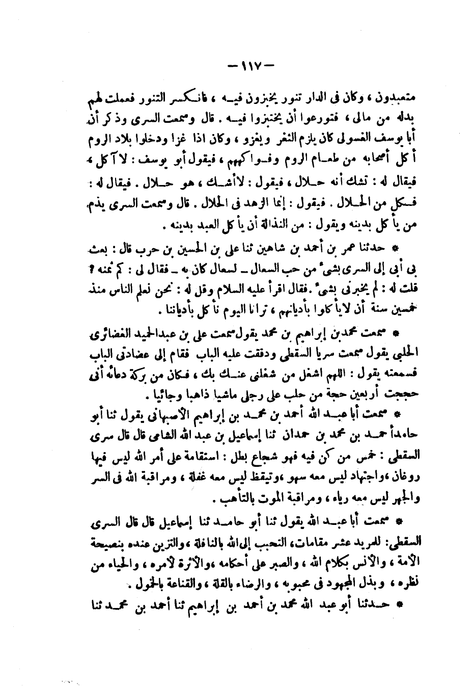 سَمِعْتُ مُحَمَّدَ بْنَ إِبْرَاهِيمَ بْنِ مُحَمَّدٍ، يَقُولُ: سَمِعْتُ عَلِيَّ بْنَ عَبْدِ الْحَمِيدِ الْغَضَائِرِيَّ الْحَلَبِيَّ، يَقُولُ: سَمِعْتُ سَرِيًّا السَّقَطِيَّ، وَدَقَقْتُ عَلَيْهِ الْبَابَ فَقَامَ إِلَى عِضَادَتَيِ الْبَابِ فَسَمِعْتُهُ يَقُولُ: «§اللَّهُمَّ اشْغَلْ مَنْ شَغَلَنِي عَنْكَ بِكَ فَكَانَ مِنْ بَرَكَةِ دُعَائِهِ أَنِّي حَجَجْتُ أَرْبَعِينَ حَجَّةً مِنْ حَلَبٍ عَلَى رِجْلَيَّ مَاشِيًا ذَاهِبًا وَجَائِيًا»