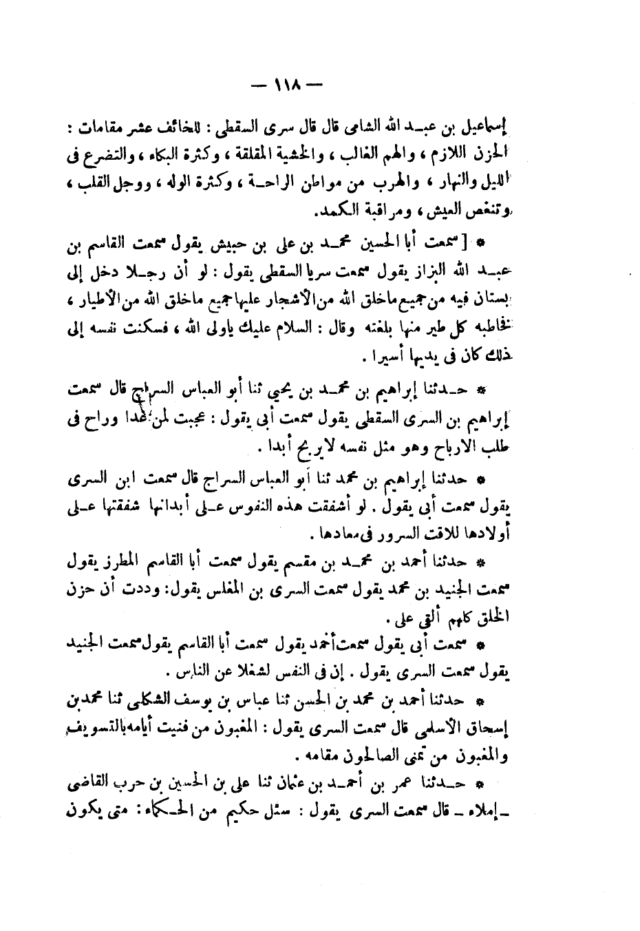 سَمِعْتُ أَبِي يَقُولُ: سَمِعْتُ أَحْمَدَ، يَقُولُ: سَمِعْتُ أَبَا الْقَاسِمِ، يَقُولُ: سَمِعْتُ الْجُنَيْدَ، يَقُولُ: سَمِعْتُ السَّرِيَّ، يَقُولُ: «§إِنَّ فِي النَّفْسِ لَشُغْلًا عَنِ النَّاسِ»