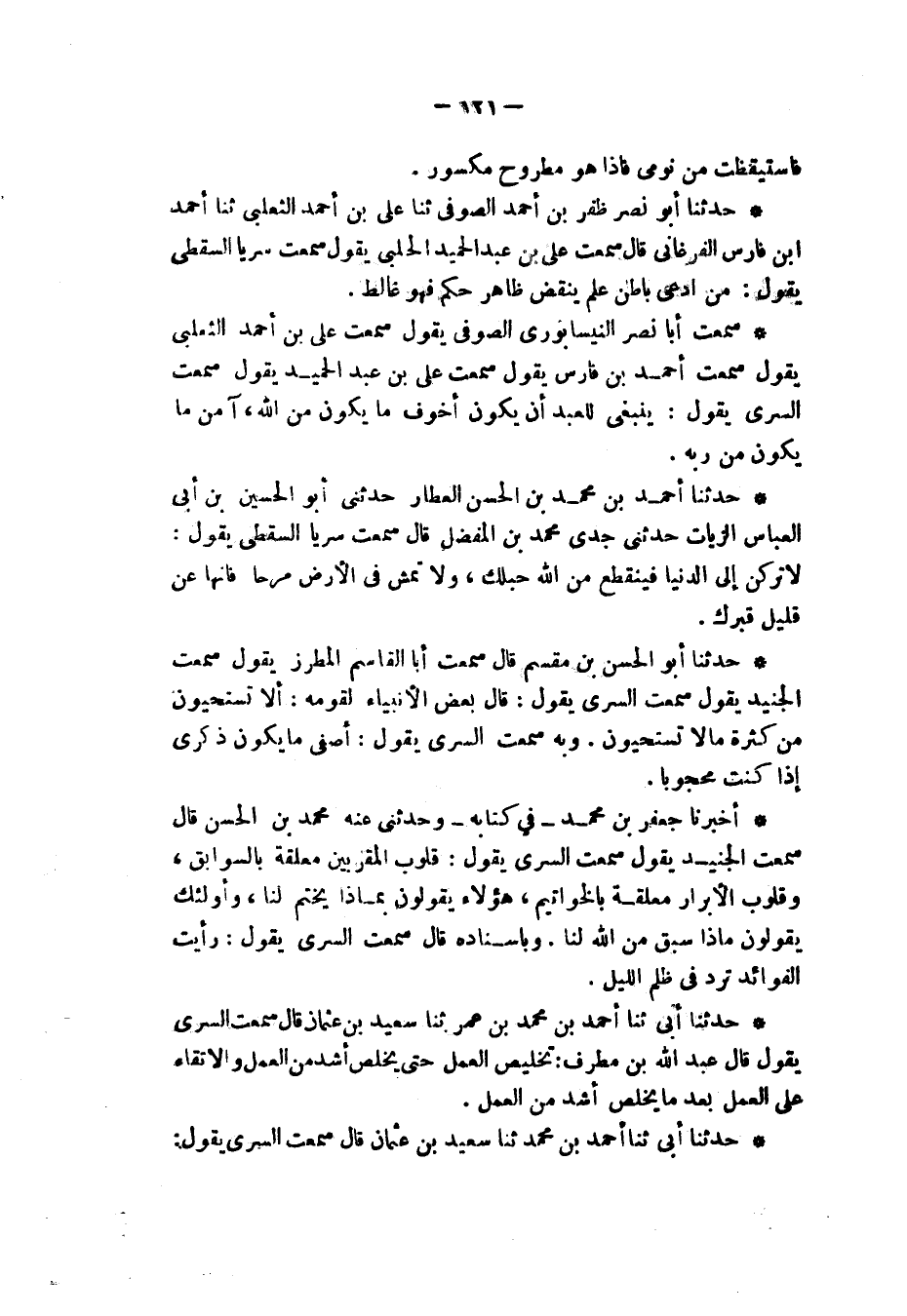 وَبِإِسْنَادِهِ قَالَ: سَمِعْتُ السَّرِيَّ، يَقُولُ: «§رَأَيْتُ الْفَوَائِدَ تَرِدُ فِي ظُلَمِ اللَّيْلِ»