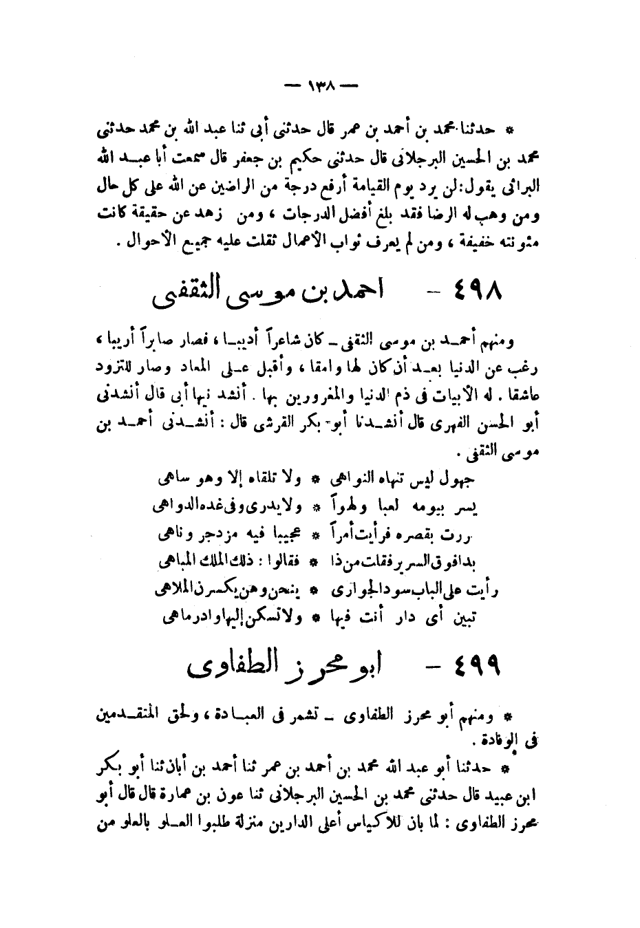 §أَحْمَدُ بْنُ مُوسَى الثَّقَفِيُّ وَمِنْهُمْ أَحْمَدُ بْنُ مُوسَى الثَّقَفِيُّ كَانَ شَاعِرًا أَديِبًا فَصَارَ صَابِرًا أَرِيبًا رَغِبَ عَنِ الدُّنْيَا بَعْدَ أَنْ كَانَ لَهَا وَامِقًا وَأَقْبَلَ عَلَى الْمَعَادِ وَصَارَ لِلتَّزَوُّدِ عَاشِقًا لَهُ الْأَبْيَاتُ فِي ذَمِّ الدُّنْيَا وَالْمَغْرُورِينَ بِهَا أَنْشَدَنِيهَا أَبِي قَالَ: أَنْشَدَنِي أَبُو الْحَسَنِ الْفِهْرِيُّ قَالَ: أَنْشَدَنَا أَبُو بَكْرٍ الْقُرَشِيُّ قَالَ: أَنْشَدَنِي أَحْمَدُ بْنُ مُوسَى الثَّقَفِيُّ: