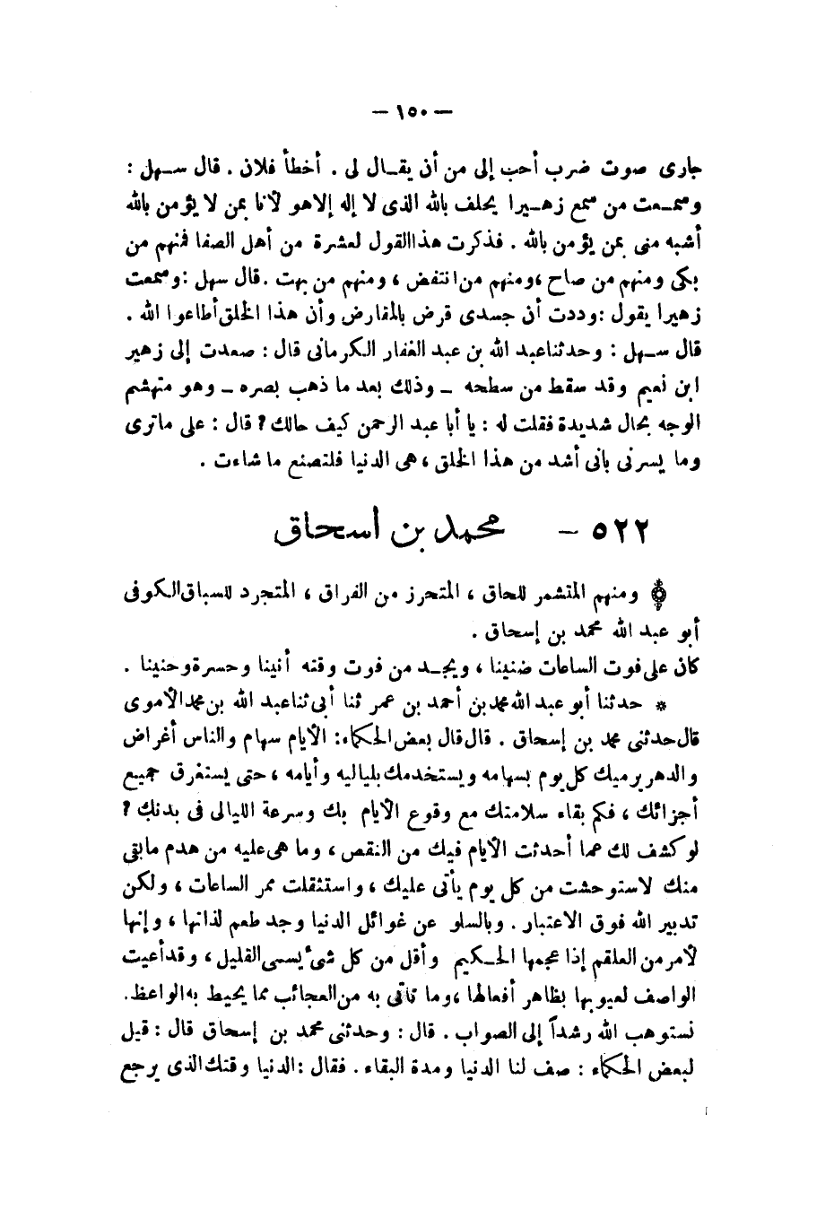 §مُحَمَّدُ بْنُ إِسْحَاقَ وَمِنْهُمُ الْمُتَشَمِّرُ لِلِّحَاقِ الْمُتَحَرِّزُ مِنَ الْفِرَاقِ الْمُتَجَرِّدُ لِلسِّبَاقِ الْكُوفِيُّ أَبُو عَبْدِ اللَّهِ مُحَمَّدُ بْنُ إِسْحَاقَ , كَانَ عَلَى فَوْتِ السَّاعَاتِ ضَنِينًا وَيَجِدُ مِنْ فَوْتِ وَقْتِهِ أَنِينًا وَحَسْرَةً وَحَنِينًا