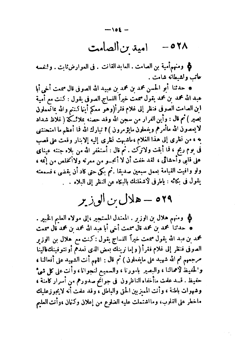 حَدَّثَنَا أَبُو الْحَسَنِ مُحَمَّدُ بْنُ مُحَمَّدِ بْنِ عُبَيْدٍ الصُّوفِيُّ قَالَ: سَمِعْتُ أَخِيَ أَبَا عَبْدِ اللَّهِ مُحَمَّدَ بْنَ مُحَمَّدٍ يَقُولُ: سَمِعْتُ خَيْرًا النَّسَّاجَ الصُّوفِيَّ يَقُولُ: كُنْتُ مَعَ أُمَيَّةَ بْنِ الصَّامِتِ الصُّوفِيِّ فَنَظَرَ إِلَى غُلَامٍ فَقَرَأَ: {§وَهُوَ مَعَكُمْ أَيْنَمَا كُنْتُمْ وَاللَّهُ بِمَا تَعْمَلُونَ بَصِيرٌ} ثُمَّ قَالَ: وَأَيْنَ الْفِرَارُ مِنْ سِجْنِ اللَّهِ وَقَدْ حَصَّنَهُ بِمَلَائِكَةٍ {غِلَاظٌ شِدَادٌ لَا يَعْصُونَ اللَّهَ مَا أَمَرَهُمْ وَيَفْعَلُونَ مَا يُؤْمَرُونَ} [التحريم: 6]؟ تَبَارَكَ اللَّهُ فَمَا أَعْظَمَ مَا امْتَحَنْتَنِي بِهِ مِنْ نَظَرِي إِلَى هَذَا الْغُلَامِ مَا شَبَّهْتُ نَظَرِي إِلَيْهِ إِلَّا بِنَارٍ وَقَعَتْ عَلَى قَصَبٍ فِي يَوْمِ رِيحٍ فَمَا أَبْقَتْ وَلَا تَرَكَتْ , ثُمَّ قَالَ: أَسْتَغْفِرُ اللَّهَ مِنْ بَلَاءٍ جَنَتْهُ عَيْنَايَ عَلَى قَلْبِي وَأَحْشَائِي لَقَدْ خِفْتُ أَنْ لَا أَنْجُوَ مِنْ مَعَرَّتِهِ وَلَا أَتَخَلَّصَ مِنْ إِثْمِهِ وَلَوْ وَافَيْتُ الْقِيَامَةَ بِعَمَلِ سَبْعِينَ صِدِّيقًا , ثُمَّ بَكَى حَتَّى كَادَ أَنْ يَقْضِيَ فَسَمِعْتُهُ يَقُولُ فِي بُكَائِهِ: يَا طَرْفِي لَأَشْغَلَنَّكَ بِالْبُكَاءِ عَنِ النَّظَرِ إِلَى الْبَلَاءِ "