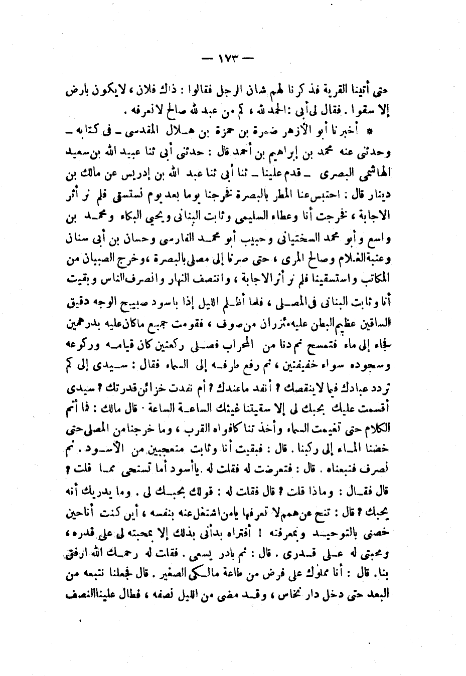 أَخْبَرَنَا أَبُو الْأَزْهَرِ ضَمْرَةُ بْنُ حَمْزَةَ بْنِ هِلَالٍ الْمَقْدِسِيُّ فِي كِتَابِهِ , وَحَدَّثَنِي عَنْهُ مُحَمَّدُ بْنُ إِبْرَاهِيمَ بْنِ أَحْمَدَ قَالَ: حَدَّثَنِي أَبِي , ثنا عُبَيْدُ اللَّهِ بْنُ سَعِيدٍ الْهَاشِمِيُّ الْبَصْرِيُّ , قَدِمَ عَلَيْنَا ثنا أَبِي , ثنا عَبْدُ اللَّهِ بْنُ إِدْرِيسَ , عَنْ مَالِكِ بْنِ دِينَارٍ قَالَ: " §احْتَبَسَ عَنَّا الْمَطَرُ بِالْبَصْرَةِ فَخَرَجْنَا يَوْمًا بَعْدَ يَوْمٍ نَسْتَسْقِي فَلَمْ نَرَ أَثَرَ الْإِجَابَةِ فَخَرَجْتُ أَنَا وَعَطَاءٌ السُّلَيْمِيُّ وَثَابِتٌ الْبُنَانِيُّ , وَيَحْيَى الْبَكَّاءُ , وَمُحَمَّدُ بْنُ وَاسِعٍ , وَأَبُو مُحَمَّدٍ السَّخْتِيَانِيُّ , وَحَبِيبٌ أَبُو مُحَمَّدٍ الْفَارِسِيُّ , وَحَسَّانُ بْنُ أَبِي سِنَانٍ , وَعُتْبَةُ الْغُلَامُ , وَصَالِحٌ الْمُرِّيُّ حَتَّى صِرْنَا إِلَى مُصَلًّى بِالْبَصْرَةِ وَخَرَجَ الصِّبْيَانُ مِنَ الْمُكَاتَبِ وَاسْتَسْقَيْنَا فَلَمْ نَرَ أَثَرَ الْإِجَابَةِ وَانْتَصَفَ النَّهَارُ وَانْصَرَفَ النَّاسُ وَبَقِيَتُ أَنَا وَثَابِتٌ الْبُنَانِيُّ فِي الْمُصَلَّى فَلَمَّا أَظْلَمَ اللَّيْلُ إِذَا بِأَسْوَدَ صَبِيحِ الْوَجْهِ دَقِيقِ السَّاقَيْنِ عَظِيمِ الْبَطْنِ عَلَيْهِ مِئْزَرَانِ مِنْ صُوفٍ فَقَوَّمْتِ جَمِيعَ مَا كَانَ عَلَيْهِ بِدِرْهَمَيْنِ فَجَاءَ إِلَى مَاءٍ فَتَمَسَّحَ ثُمَّ دَنَا مِنَ الْمِحْرَابِ فَصَلَّى رَكْعَتَيْنِ كَانَ قِيَامُهُ وَرُكُوعُهُ وَسُجُودُهُ سَوَاءً خَفِيفَتَيْنِ ثُمَّ رَفَعَ طَرْفَهُ إِلَى السَّمَاءِ فَقَالَ: سَيِّدِي إِلَى كَمْ تَرْدُدْ عِبَادَكَ فِيمَا لَا يَنْقُصُكَ أَنَفَدَ مَا عِنْدَكَ أَمْ فَقَدْتَ خَزَائِنَ قُدْرَتِكَ؟ سَيِّدِي أَقْسَمْتُ عَلَيْكَ بِحُبِّكَ لِي إِلَّا سَقَيْتَنَا غَيْثَكَ السَّاعَةَ السَّاعَةَ , قَالَ: مَالِكٌ: فَمَا أَتَمَّ الْكَلَامَ حَتَّى تَغَيَّمَتِ السَّمَاءُ وَأَخَذَتْنَا كَأَفْوَاهِ الْقِرَبِ وَمَا خَرَجْنَا مِنَ الْمُصَلَّى حَتَّى خُضْنَا الْمَاءَ إِلَى رُكَبِنَا , قَالَ: فَبَقِيَتْ أَنا وَثَابِتٌ مُتَعَجِّبِينَ مِنَ الْأَسْوَدِ , ثُمَّ انْصَرَفَ فَتَبِعْنَاهُ , قَالَ: فَتَعَرَّضَتْ لَهُ فَقُلْتُ لَهُ: يَا أَسْوَدُ , أَمَا تَسْتَحِي مِمَّا قُلْتَ؟ قَالَ: فَقَالَ: وَمَاذَا قُلْتُ؟ قَالَ: فَقُلْتُ لَهُ: قَوْلُكُ بِحُبِّكَ لِي , وَمَا يُدْرِيكَ أَنَّهُ يُحِبُّكَ؟ قَالَ: تَنَحَّ عَنْ هِمَمٍ لَا تَعْرِفُهَا يَا مَنِ اشْتَغَلَ عَنْهُ بِنَفْسِهِ أَيْنَ كُنْتُ أَنَا حِينَ خَصَّنِي بِالتَّوْحِيدِ وَبِمَعْرِفَتِهِ؟ أَفَتُرَاهُ بَدَأَنِي بِذَلِكَ إِلَّا بِمَحَبَّتِهِ لِي عَلَى قَدْرِهِ وَمَحَبَّتِي لَهُ عَلَى قِدْرِي؟ قَالَ: ثُمَّ بَادَرَ يَسْعَى , فَقُلْتُ لَهُ: رَحِمَكَ اللَّهُ ارْفُقْ بِنَا , قَالَ: أَنا مَمْلُوكٌ عَلَى فَرْضٍ مِنْ طَاعَةِ مَالِكِي الصَّغِيرِ , قَالَ: فَجَعَلْنَا نَتَّبِعُهُ مِنَ الْبُعْدِ حَتَّى دَخَلَ دَارَ نَخَّاسٍ وَقَدْ مَضَى مِنَ اللَّيْلِ نِصْفُهُ فَطَالَ عَلَيْنَا النِّصْفُ -[174]- الْبَاقِي , فَلَمَّا أَصْبَحْنَا أَتَيْتُ النَّخَّاسَ فَقُلْتُ لَهُ: عِنْدَكَ غُلَامٌ تَبِيعَنِيهِ لِلْخِدْمَةِ؟ قَالَ: نَعَمْ عِنْدِي مِائَةُ غُلَامٍ كُلُّهُمْ لِذَلِكَ , قَالَ: فَجَعَلَ يُخْرِجُ إِلَيَّ وَاحِدًا بَعْدَ آخَرَ وَأَنَا أَقُولُ: غَيْرُ هَذَا حَتَّى عَرَضَ عَلَيَّ تِسْعِينَ غُلَامًا ثُمَّ قَالَ: مَا بَقِيَ عِنْدِي غَيْرُهَا وَلَا وَاحِدٌ قَالَ: فَلَمَّا أَرَدْنَا الْخُرُوجَ دَخَلْتُ أَنا حُجْرَةً خَرِبَةً فِي خَلْفِ دَارِهِ فَإِذَا أَنا بِالْأَسْوَدِ نَائِمٌ , فَكَانَ وَقْتُ الْقَيْلُولَةِ , فَقُلْتُ: هُوَ هُوَ وَرَبِّ الْكَعْبَةِ فَخَرَجْتُ إِلَى عِنْدِ النَّخَّاسِ فَقُلْتُ لَهُ: بِعْنِي ذَلِكَ ا