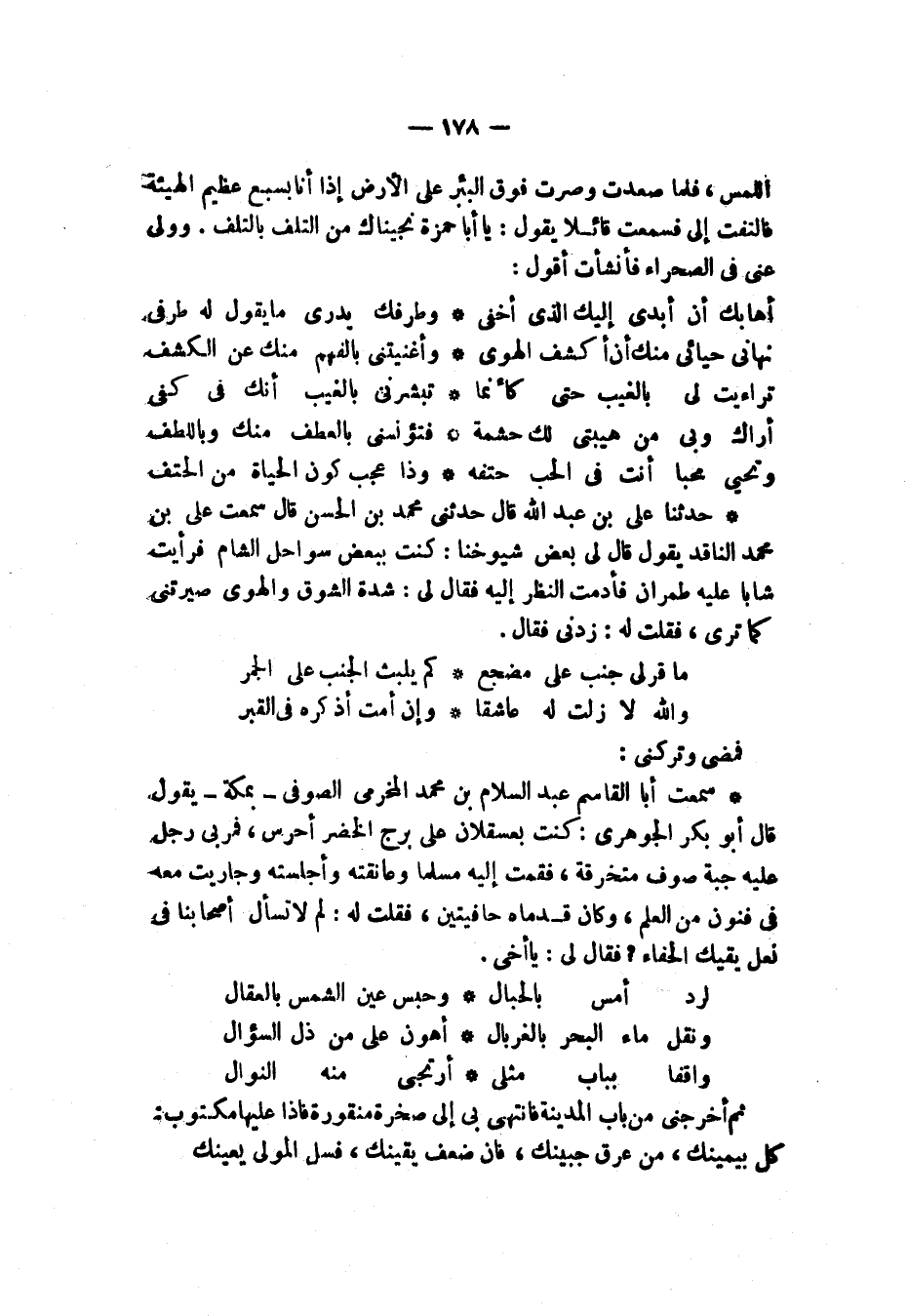 حَدَّثَنَا عَلِيُّ بْنُ عَبْدِ اللَّهِ قَالَ حَدَّثَنِي مُحَمَّدُ بْنُ الْحَسَنِ قَالَ: سَمِعْتُ عَلِيَّ بْنَ مُحَمَّدٍ النَّاقِدَ يَقُولُ: قَالَ لِي بَعْضُ شُيوخِنَا: " §كُنْتُ بِبَعْضِ سَوَاحِلِ الشَّامِ فَرَأَيْتُ شَابًّا عَلَيْهِ طِمْرَانِ فَأَدَمْتُ النَّظَرَ إِلَيْهِ فَقَالَ لِي: شِدَّةُ الشَّوْقِ وَالْهَوَى صَيَّرَتْنِي كَمَا تَرَى فَقُلْتُ لَهُ: زِدْنِي فَقَالَ: