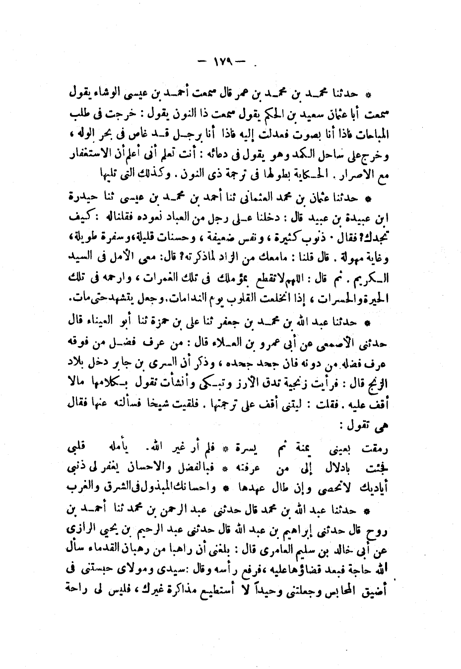 حَدَّثَنَا مُحَمَّدُ بْنُ مُحَمَّدِ بْنِ عُمَرَ قَالَ: سَمِعْتُ أَحْمَدَ بْنَ عِيسَى الْوَشَّاءَ يَقُولُ: سَمِعْتُ أَبَا عُثْمَانَ سَعِيدَ بْنَ الْحَكَمِ يَقُولُ: سَمِعْتُ ذَا النُّونِ يَقُولُ: " §خَرَجْتُ فِي طَلَبِ الْمُبَاحَاتِ فَإِذَا أَنَا بِصَوْتٍ , فَعَدَلْتُ إِلَيْهِ فَإِذَا أَنَا بِرَجُلٍ , قَدْ غَاصَ فِي بَحْرِ الْوَلَهِ وَخَرَجَ عَلَى سَاحِلِ الْكَمَدِ وَهُوَ يَقُولُ فِي دُعَائِهِ: أَنْتَ تَعْلَمُ أَنِّي أَعْلَمُ أَنَّ الِاسْتِغْفَارَ مَعَ الْإِصْرَارِ " , الْحِكَايَةُ بِطُولِهَا فِي تَرْجَمَةِ ذِي النُّونِ , وَكَذَلِكَ الَّتِي تَلِيهَا