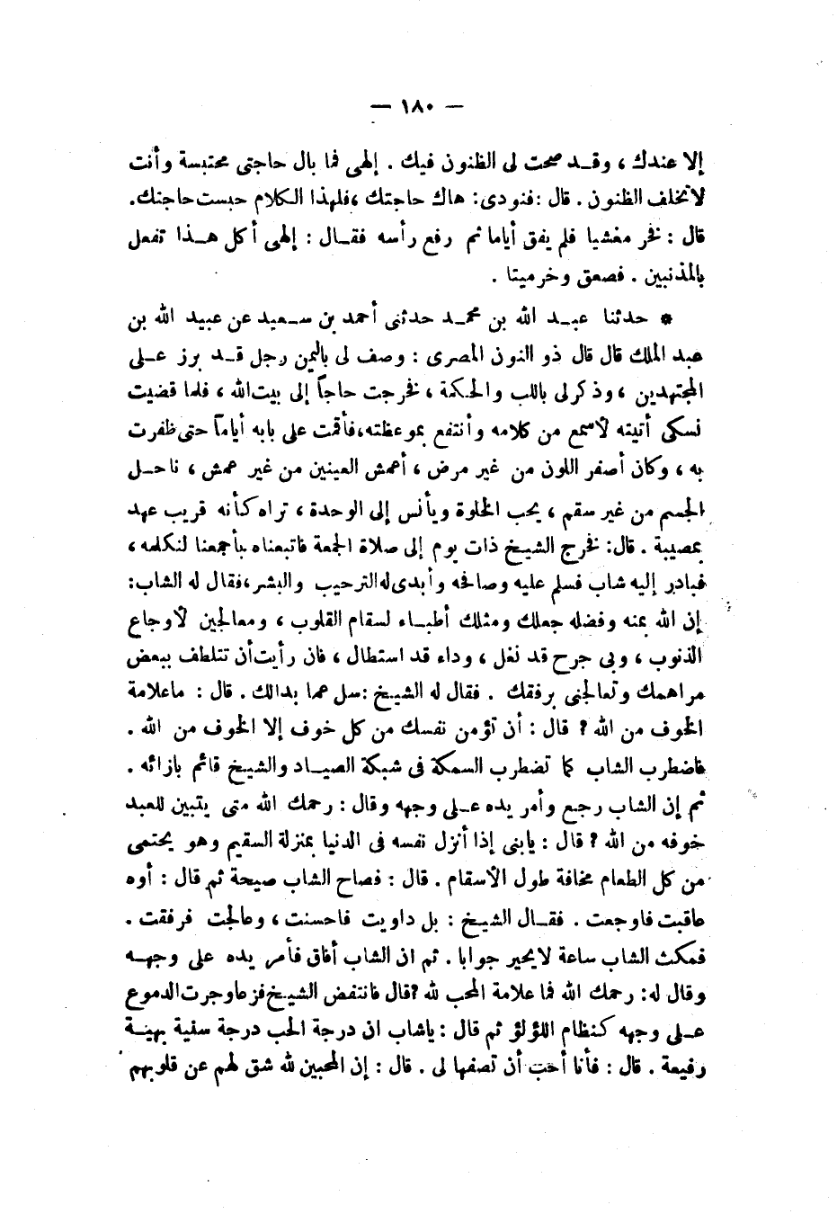 حَدَّثَنَا عَبْدُ اللَّهِ بْنُ مُحَمَّدٍ، حَدَّثَنِي أَحْمَدُ بْنُ سَعِيدٍ، عَنْ عُبَيْدِ اللَّهِ بْنِ عَبْدِ الْمَلِكِ قَالَ: قَالَ: ذُو النُّونِ الْمِصْرِيُّ: " §وُصِفَ لِي بِالْيَمَنِ رَجُلٌ قَدْ بَرَزَ عَلَى الْمُجْتَهِدِينَ وَذُكِرَ لِي بِاللُّبِّ وَالْحِكْمَةِ فَخَرَجْتُ حَاجًّا إِلَى بَيْتِ اللَّهِ فَلَمَّا قَضَيْتُ نُسُكِي أَتَيْتُهُ لِأَسْمَعَ مِنْ كَلَامِهِ وَأَنْتَفِعَ بِمَوْعِظَتِهِ فَأَقَمْتُ عَلَى بَابِهِ أَيَّامًا حَتَّى ظَفِرْتُ بِهِ وَكَانَ أَصْفَرَ اللَّوْنِ مِنْ غَيْرِ مَرَضٍ أَعْمَشَ الْعَيْنَيْنِ مِنْ غَيْرُ عَمَشٍ نَاحِلَ الْجِسْمِ مِنْ غَيْرِ سَقَمٍ يُحِبُّ الْخَلْوَةَ وَيَأْنَسُ إِلَى الْوَحْدَةِ تَرَاهُ كَأَنَّهُ قَرِيبُ عَهْدٍ بِمُصِيبَةٍ قَالَ: فَخَرَجَ الشَّيْخُ ذَاتَ يَوْمٍ إِلَى صَلَاةِ الْجُمُعَةِ فَاتَّبَعْنَاهُ بِأَجْمَعِنَا لِنُكَلِّمَهُ فَبَادَرَ إِلَيْهِ شَابٌّ فَسَلَّمَ عَلَيْهِ وَصَافَحَهُ وَأَبْدَى لَهُ التَّرْحِيبَ وَالْبِشْرَ فَقَالَ لَهُ الشَّابُّ: إِنَّ اللَّهَ بَمَنِّهِ وَفَضْلِهِ جَعَلَكَ وَمِثْلَكَ أَطِبَّاءَ لِسِقَامِ الْقُلُوبِ وَمُعَالِجِينَ لِأَوْجَاعِ الذُّنُوبِ وَبِي جُرْحٌ قَدْ نَغَلَ وَدَاءٌ قَدِ اسْتَطَالَ فَإِنْ رَأَيْتَ أَنْ تَتَلَطَّفَ بِبَعْضِ مَرَاهِمِكَ وَتُعَالِجَنِي بِرِفْقِكَ، فَقَالَ لَهُ الشَّيْخُ: سَلْ عَمَّا بَدَا لَكَ قَالَ: مَا عَلَامَةُ الْخَوْفِ مِنَ اللَّهِ؟ قَالَ: أَنْ تُؤَمِّنَ نَفْسَكَ مِنْ كُلِّ خَوْفٍ إِلَّا الْخَوْفَ مِنَ اللَّهِ، فَاضْطَرَبَ الشَّابُّ كَمَا تَضْطَرِبُ السَّمَكَةُ فِي شَبَكَةِ الصَّيَّادِ وَالشَّيْخُ قَائِمٌ بِإِزَائِهِ، ثُمَّ إِنَّ الشَّابَّ رَجَّعَ وَأَمَرَّ يَدَهُ عَلَى وَجْهِهِ وَقَالَ: رَحِمَكَ اللَّهُ مَتَى يَتَبَيَّنُ لِلْعَبْدِ خَوْفُهُ مِنَ اللَّهِ؟ قَالَ: يَا بُنَيَّ إِذَا أَنْزَلَ نَفْسَهُ فِي الدُّنْيَا بِمَنْزِلَةِ السَّقِيمِ وَهُوَ يَحْتَمِي مِنْ كُلِّ الطَّعَامِ مَخَافَةَ طُولِ الْأَسْقَامِ، قَالَ: فَصَاحَ الشَّابُّ صَيْحَةً ثُمَّ قَالَ: أَوِّهْ عَاقَبْتَ فَأَوْجَعْتَ، فَقَالَ الشَّيْخُ: بَلْ دَاوَيْتُ فَأَحْسَنْتُ وَعَالَجْتُ فَرَفَقْتُ، فَمَكَثَ الشَّابُّ سَاعَةً لَا يَحِيرُ جَوَابًا، ثُمَّ إِنَّ الشَّابَّ أَفَاقَ فَأَمَرَّ يَدَهُ عَلَى وَجْهِهِ وَقَالَ لَهُ: رَحِمَكَ اللَّهُ فَمَا عَلَامَةُ الْمُحِبِّ لِلَّهِ؟ قَالَ: فَانْتَفَضَ الشَّيْخُ فَزَعًا وَجَرَتِ الدُّمُوعُ عَلَى وَجْهِهِ كَنِظَامِ اللُّؤْلُؤِ ثُمَّ قَالَ: يَا شَابُّ إِنَّ دَرَجَةَ الْحُبِّ دَرَجَةٌ سَنِيَّةٌ بَهِيَّةٌ رَفِيعَةٌ، قَالَ: فَأَنَا أُحِبُّ أَنْ تَصِفَهَا لِي، قَالَ: إِنَّ الْمُحِبِّينَ لِلَّهِ شَقَّ لَهُمْ عَنْ قُلُوبِهِمْ -[181]-، فَأَبْصَرُوا بِنُورِ الْقُلُوبِ عَظَمَةَ اللَّهِ جَلَّ جَلَالُهُ فَصَارَتْ أَبْدَانُهُمْ دُنْيَوِيَّةً وَقُلُوبُهُمْ سَمَاوِيَّةً وَأَرْوَاحُهُمْ حُجُبِيَّةً وَعُقُولُهُمْ نُورَانِيَّةً تَسْرَحُ بَيْنَ صُفُوفِ الْمَلَائِكَةِ بِالْعِيَانِ وَتُشَاهِدُ تِلْكَ الْأُمُورَ بِالتَّحْقِيقِ وَالْبَيَانِ فعَبْدُوا اللَّهَ بِمَبْلِغَ اسْتِطَاعَتِهِمْ لَا لِجَنَّةٍ وَلَا لِنَارٍ، قَالَ: فَصَاحَ الشَّابُّ صَيْحَةً ثُمَّ خَرَّ مَغْشِيًّا عَلَيْهِ فَحَرَّكْنَاهُ فَإِذَا هُوَ قَدْ فَارَقَ الدُّنْيَا فَانْكَبَّ الشَّيْخُ يُقَبِّلُ بَيْنَ عَيْنَيْهِ وَيَبْكِي وَيَقُولُ: هَذَا مَصْرَعُ الْخَائِفِينَ وَهَذِهِ دَرَجَةُ الْمُجْتَهِدِينَ، وَهَذِهِ مَنَازِلُ الْمُتَّقِينَ "