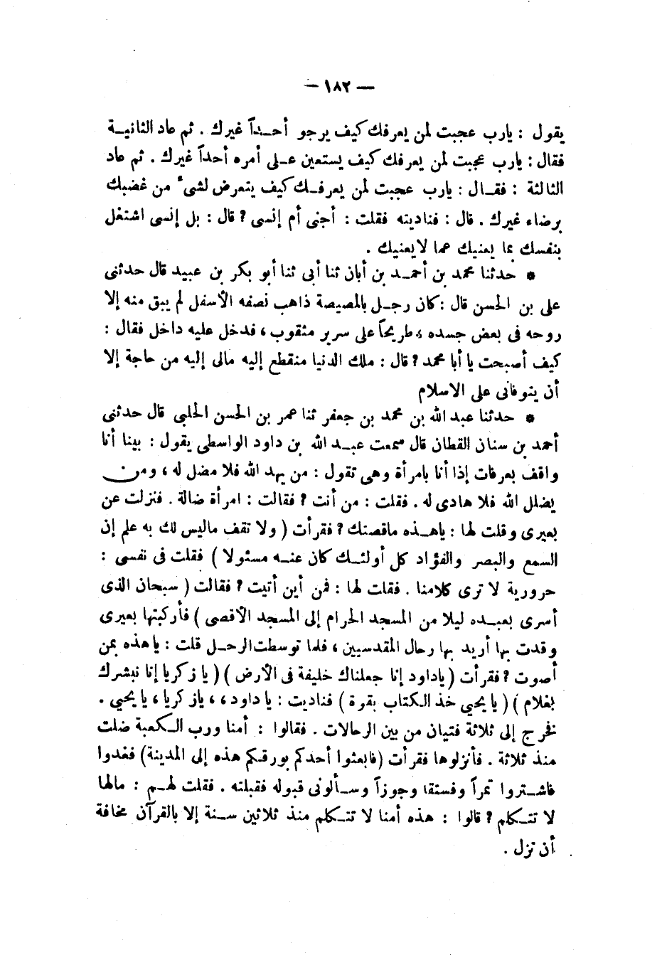 حَدَّثَنَا عَبْدُ اللَّهِ بْنُ مُحَمَّدِ بْنِ جَعْفَرٍ، ثنا عُمَرُ بْنُ الْحَسَنِ الْحَلَبِيُّ قَالَ: حَدَّثَنِي أَحْمَدُ بْنُ سِنَانٍ الْقَطَّانُ قَالَ: سَمِعْتُ عَبْدَ اللَّهِ بْنَ دَاودَ الْوَاسِطِيَّ، يَقُولُ: " بَيْنَا أَنَا وَاقِفٌ، بِعَرَفَاتٍ إِذَا أَنَا بِامْرَأَةٍ، وَهِيَ تَقُولُ: §مَنْ يهْدِ اللَّهُ فَلَا مُضِلَّ لَهُ وَمَنْ يُضْلِلِ اللَّهُ فَلَا هَادِيَ لَهُ، فَقُلْتُ: مَنْ أَنْتِ؟ فَقَالَتِ: امْرَأَةٌ ضَالَّةٌ، فَنَزَلْتُ عَنْ بَعِيرِي، وَقُلْتُ لَهَا: يَا هَذِهِ، مَا قِصَّتُكِ؟ فَقَرَأْتُ: {وَلَا تَقْفُ مَا لَيْسَ لَكَ بِهِ عِلْمٌ إِنَّ السَّمْعَ وَالْبَصَرَ وَالْفُؤَادَ كُلُّ أُولَئِكَ كَانَ عَنْهُ مَسْئُولًا}، فَقُلْتُ فِي نَفْسِي: حَرُورِيَّةٌ لَا تَرَى كَلَامَنَا، فَقُلْتُ لَهَا: فَمِنْ أَيْنَ أَتَيْتِ؟ فَقَالَتْ: {سُبْحَانَ الَّذِي أَسْرَى بِعَبْدِهِ لَيْلًا مِنَ الْمَسْجِدِ الْحَرَامِ إِلَى الْمَسْجِدِ الْأَقْصَى} [الإسراء: 1]، فَأَرْكَبْتُهَا بَعِيرِي وَقَدْتُ بِهَا أُرِيدُ بِهَا رِحَالَ الْمَقْدِسِيِّينَ فَلَمَّا تَوَسَّطْتُ الرَّحْلَ قُلْتُ: يَا هَذِهِ بِمَنْ أُصَوِّتُ؟ فَقَرَأَتْ: {يَا دَاودُ إِنَّا جَعَلْنَاكَ خَلِيفَةً فِي الْأَرْضِ}، {يَا زَكَرِيَّا إِنَّا نُبَشِّرُكَ بِغُلَامٍ} [مريم: 7]، {يَا يَحْيَى خُذِ الْكِتَابَ بِقُوَّةٍ} [مريم: 12] فَنَادَيْتُ: يَا دَاودُ، يَا زَكَرِيَّا، يَا يَحْيَى، فَخَرَجَ إِلَيَّ ثَلَاثَةُ فَتَيَانٍ مِنْ بَيْنِ الرِّحَالَاتِ، فَقَالُوا: أُمُّنَا وَرَبِّ الْكَعْبَةِ ضَلَّتْ مُنْذُ ثَلَاثَةٍ، فَأَنْزَلُوهَا فَقَرَأَتْ: {فَابْعَثُوا أَحَدَكُمْ بِوَرِقِكُمْ هَذِهِ إِلَى الْمَدِينَةِ} [الكهف: 19] فَغَدَوْا فَاشْتَرَوْا تَمْرًا وَفُسْتُقًا وَجَوْزًا وَسَأَلُونِي قَبُولَهُ فَقَبِلْتُهُ فَقُلْتُ لَهُمْ: مَا لَهَا لَا تَتَكَلَّمُ؟ قَالُوا: هَذِهِ أُمُّنَا لَا تَتَكَلَّمُ مُنْذُ ثَلَاثِينَ سَنَةً إِلَّا بِالْقُرْآنِ مَخَافَةَ أَنْ تَزِلَّ "