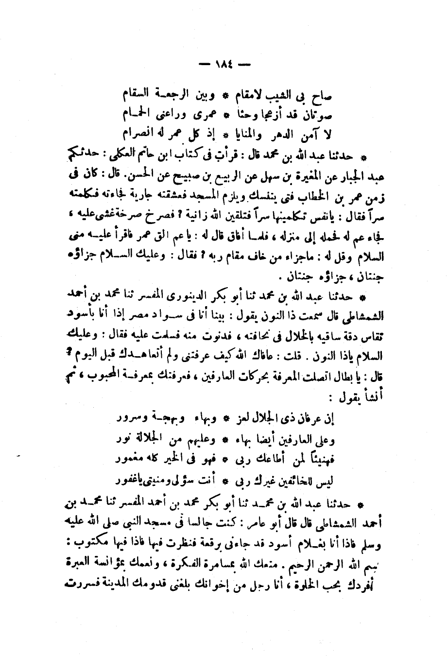 حَدَّثَنَا عَبْدُ اللَّهِ بْنُ مُحَمَّدٍ، ثنا أَبُو بَكْرٍ الدَّيْنَوَرِيُّ الْمُفَسِّرُ، ثنا مُحَمَّدُ بْنُ أَحْمَدَ الشِّمْشَاطِيُّ قَالَ: سَمِعْتُ ذَا النُّونِ، يَقُولُ: " بَيْنَا أَنَا فِي، سَوَادِ مِصْرَ إِذَا أَنَا بِأَسْوَدَ، تُقَاسُ دِقَّةُ سَاقَيْهِ بِالْخِلَالِ فِي نَحَافَتِهِ فَدَنَوْتُ مِنْهُ فَسَلَّمْتُ عَلَيْهِ فَقَالَ: وَعَلَيْكَ السَّلَامُ يَا ذَا النُّونِ، قُلْتُ: عَافَاكَ اللَّهُ كَيْفَ عَرَفْتَنِي وَلَمْ أَتَعَاهَدْكَ قَبْلَ الْيَوْمِ؟ قَالَ: يَا بَطَّالُ §اتَّصَلَتِ الْمَعْرِفَةُ بِحَرَكَاتِ الْعَارِفِينَ فَعَرَفْتُكَ بِمَعْرِفَةِ الْمَحْبُوبِ ثُمَّ أَنْشَأَ يَقُولُ: