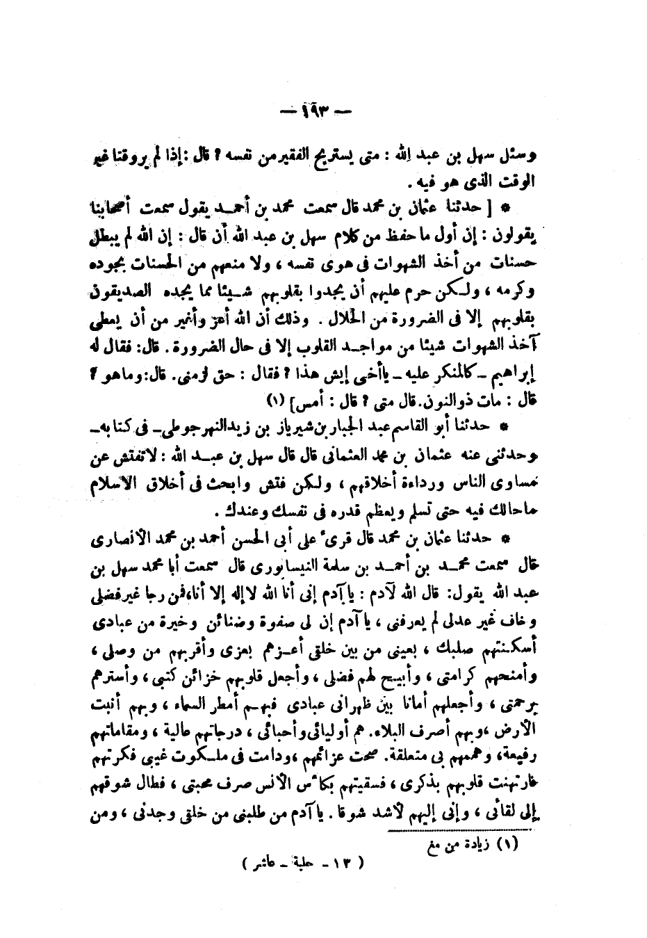 حَدَّثَنَا عُثْمَانُ بْنُ مُحَمَّدٍ قَالَ: سَمِعْتُ مُحَمَّدَ بْنَ أَحْمَدَ، يَقُولُ: سَمِعْتُ أَصْحَابَنَا، يَقُولُونَ: إِنَّ أَوَّلَ مَا حُفِظَ مِنْ كَلَامِ سَهْلِ بْنِ عَبْدِ اللَّهِ أَنْ قَالَ: " §إِنَّ اللَّهَ لَمْ يُبْطِلْ حَسَنَاتِ مَنْ أَخَذَ الشَّهَوَاتِ فِي هَوَى نَفْسِهِ وَلَا مَنَعَهُمْ مِنَ الْحَسَنَاتِ بِجُودِهِ وَكَرَمِهِ وَلَكِنْ حَرَّمَ عَلَيْهِمْ أَنْ يَجِدُوا بِقُلُوبِهِمْ شَيْئًا مِمَّا يَجِدُهُ الصِّدِّيقُونَ بِقُلُوبِهِمْ إِلَّا فِي الضَّرُورَةِ مِنَ الْحَلَالِ، وَذَلِكَ أَنَّ اللَّهَ أَعَزُّ وَأَغْيَرُ مِنْ أَنْ يُعْطِيَ آخِذَ الشَّهَوَاتِ شَيْئًا مِنْ مَوَاجِدِ الْقُلُوبِ إِلَّا فِي حَالِ الضَّرُورَةِ، قَالَ: فَقَالَ لَهُ إِبْرَاهِيمُ كَالْمُنْكِرِ عَلَيْهِ: يَا أَخِي، إِيشْ هَذَا؟ فَقَالَ: حَقٌّ لَزِمَنِي، قَالَ: وَمَا هُوَ؟ قَالَ: مَاتَ ذُو النُّونِ قَالَ: مَتَى؟ قَالَ: أَمْسِ "