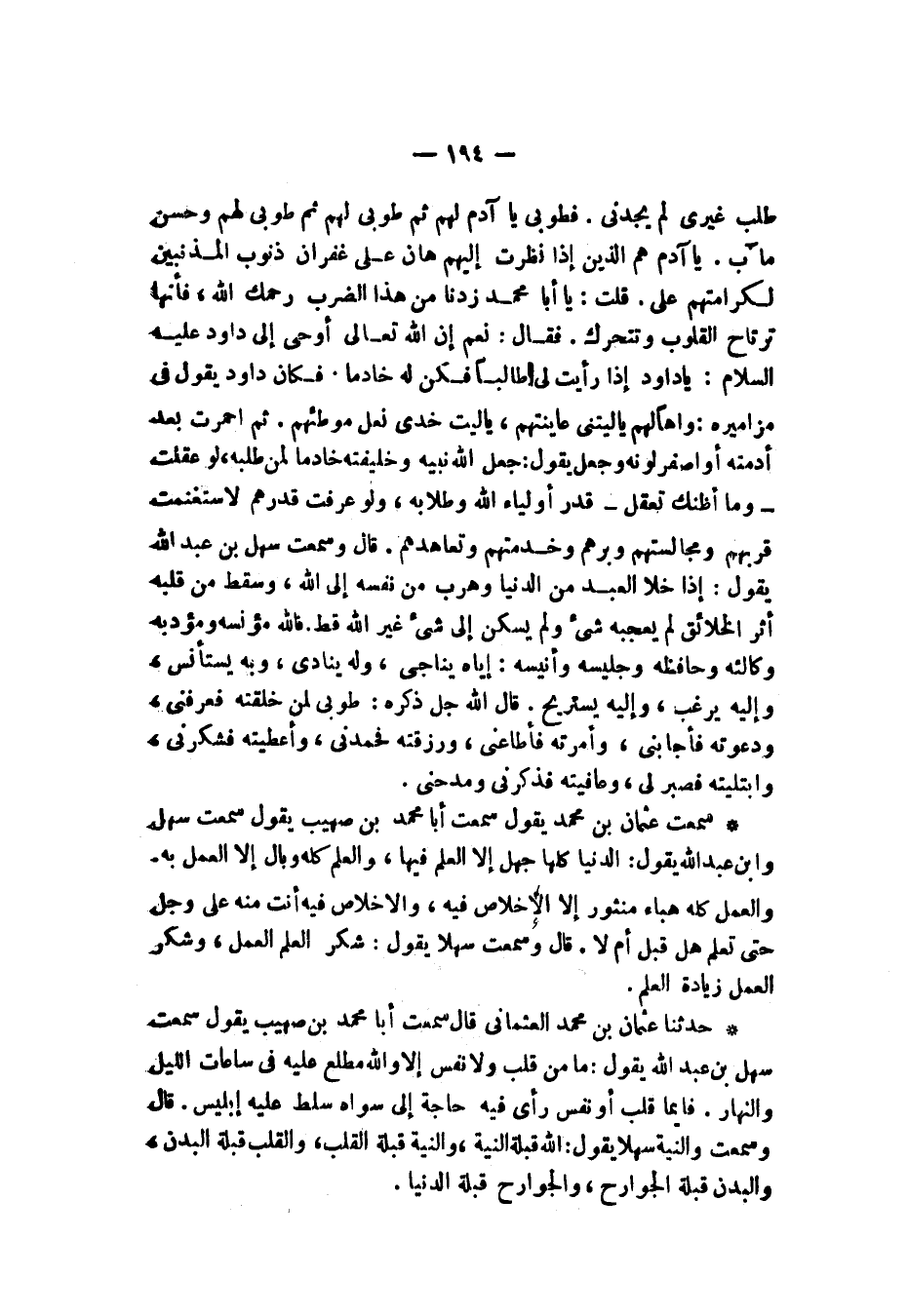 حَدَّثَنَا عُثْمَانُ بْنُ مُحَمَّدٍ الْعُثْمَانِيُّ قَالَ: سَمِعْتُ أَبَا مُحَمَّدِ بْنَ صُهَيْبٍ، يَقُولُ: سَمِعْتُ سَهْلَ بْنَ عَبْدِ اللَّهِ، يَقُولُ: «§مَا مِنْ قَلْبٍ وَلَا نَفْسٍ إِلَّا وَاللَّهُ مُطَّلِعٌ عَلَيْهِ فِي سَاعَاتِ اللَّيْلِ وَالنَّهَارِ، فَأَيُّمَا قَلْبٍ أَوْ نَفْسٍ رَأَى فِيهِ حَاجَةً إِلَى سِوَاهُ سَلَّطَ عَلَيْهِ إِبْلِيسَ»