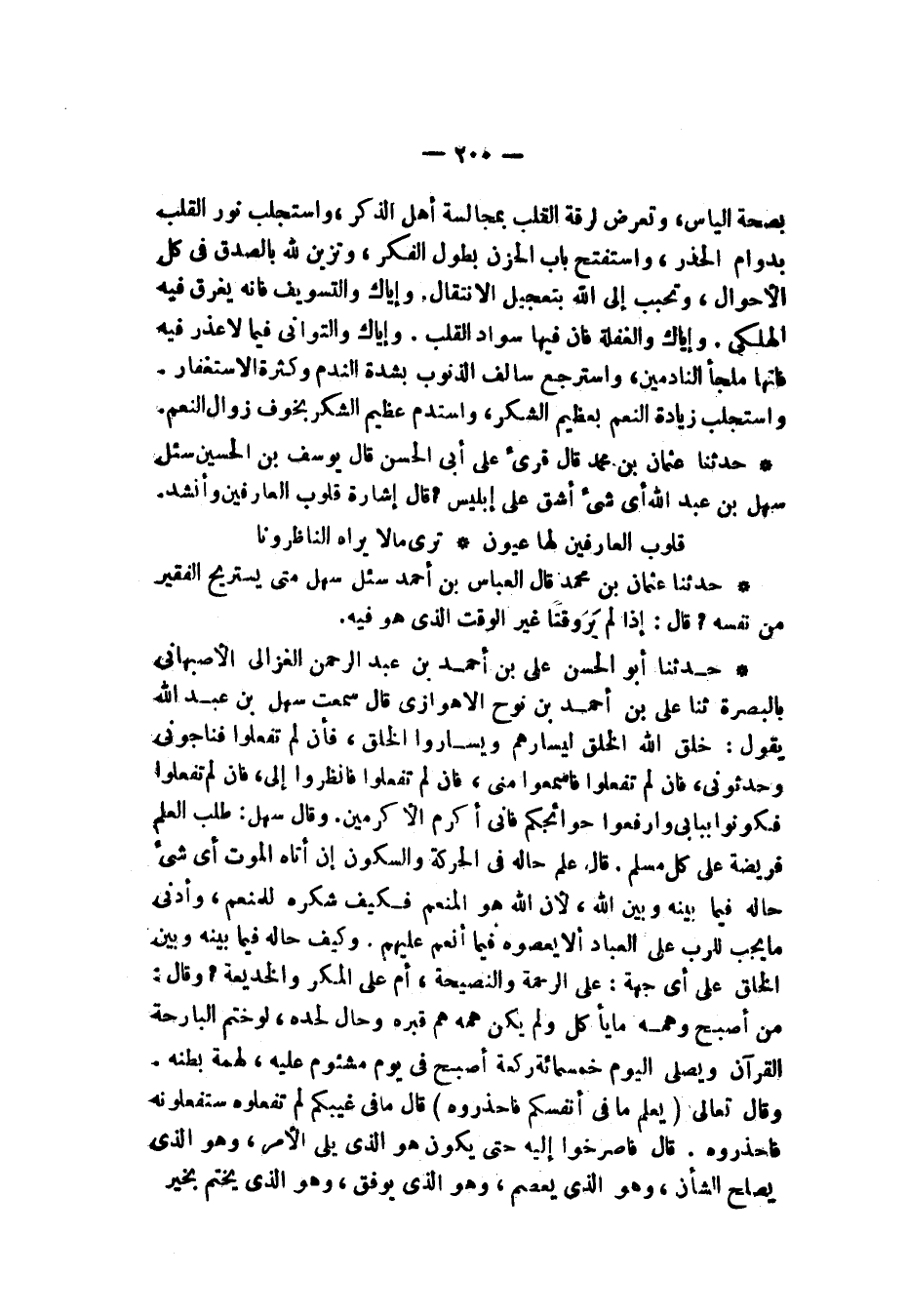 حَدَّثَنَا عُثْمَانُ بْنُ مُحَمَّدٍ قَالَ قُرِئَ عَلَى أَبِي الْحَسَنِ قَالَ يُوسُفُ بْنُ الْحُسَيْنِ: سُئِلَ سَهْلُ بْنُ عَبْدِ اللَّهِ: §أَيُّ شَيْءٍ أَشُقُّ عَلَى إِبْلِيسَ؟ قَالَ: " إِشَارَةُ قُلُوبِ الْعَارِفِينَ , وَأَنْشَدَ:
