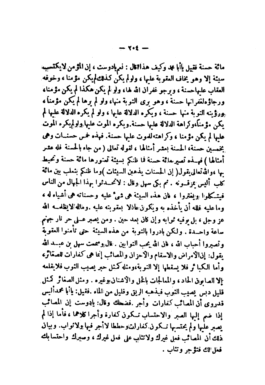 قَالَ: وَسَمِعْتُ سَهْلَ بْنَ عَبْدِ اللَّهِ، يَقُولُ: " §إِنَّ الْأَمْرَاضَ وَالْأَسْقَامَ وَالْأَحْزَانَ وَالْمَصَائِبَ إِنَّمَا هِيَ كَفَّارَاتٌ لِلصَّغَائِرِ وَأَمَّا الْكَبَائِرُ فَلَا يُسْقِطُهَا إِلَّا التَّوْبَةُ وَمَثَلُهُ كَمَثَلِ حِبْرٍ يُصِيبُ الثَّوْبَ فَلَا يَقْلَعُهُ إِلَّا الصَّابُونُ الْحَادُّ وَالْمُعَالَجَاتُ بِالْخَلِّ وَالْأُشْنَانُ وَغَيْرُهُ، وَمَثَلُ الصَّغَائِرِ كَمَثَلِ قَلِيلِ دِبْسٍ يُصِيبُ الثَّوْبَ فَيُذْهِبُهُ الرِّيقُ وَقَلِيلٌ مِنَ الْمَاءِ، فَقِيلَ: يَا أَبَا مُحَمَّدٍ، أَلَيْسَ قَدْ رُوِيَ أَنَّ الْمَصَائِبَ كَفَّارَاتٌ وَأَجْرٌ؟ فَضَحِكَ وَقَالَ: يَا دَوْسَتْ إِنَّ الْمَصَائِبَ إِذَا ضُمَّ إِلَيْهَا الصَّبْرُ وَالِاحْتِسَابُ تَكُونُ كَفَّارَةً وَأَجْرًا كِلَاهُمَا فَأَمَّا إِذَا لَمْ يَصْبِرْ عَلَيْهَا وَلَمْ يَحْتَسِبْهَا تَكُونُ كَفَّارَاتٍ وَحِطَطًا لَا أَجْرَ فِيهَا وَلَا ثَوَابَ، وَبَيَانُ ذَلِكَ أَنَّ الْمَصَائِبَ فِعْلُ غَيْرِكَ وَلَا تُثَابُ عَلَى فِعْلِ غَيْرِكَ، وَصَبْرُكَ وَاحْتِسَابُكَ فِعْلٌ لَكَ فَتُؤْجَرُ وَتُثَابُ "