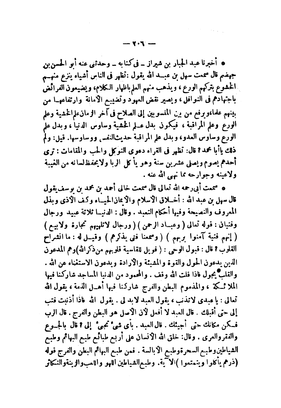 أَخْبَرَنَا عَبْدُ الْجَبَّارِ بْنُ شِيرَازَ، فِي كِتَابِهِ , وَحَدَّثَنِي عَنْهُ أَبُو الْحَسَنِ بْنُ جَهْضَمٍ قَالَ: سَمِعْتُ سَهْلَ بْنَ عَبْدِ اللَّهِ، يَقُولُ: " §تَظْهَرُ فِي النَّاسِ أَشْيَاءُ يُنْزَعُ مِنْهُمُ الْخُشُوعُ بِتَرْكِهِمُ الْوَرَعَ، وَيَذْهَبُ مِنْهُمْ العِلْمُ بِإِظْهَارِ الكَلَامِ، وَيُضَيِّعُونَ الفَرَائِضَ بِاجْتِهَادِهمْ فِي النَّوَافِلِ، وَيَصِيرُ نَقْضُ الْعُهُودِ وَتَضْيِيعُ الْأَمَانَةِ وَارْتِفَاعُهَا مِنْ بَيْنَهُمْ عِلْمًا وَيُرْفَعُ مِنْ بَيْنِ الْمَنْسُوبِينَ إِلَى الصَّلَاحِ فِي آخِرِ الزَّمَانِ عِلْمُ الْخَشْيَةِ وَعِلْمُ الْوَرَعِ وَعِلْمُ الْمُرَاقَبَةِ فَيَكُونُ بَدَلَ عِلْمِ الْخَشْيَةِ وَسَاوِسُ الدُّنْيَا وَبَدَلَ عِلْمِ الْوَرَعِ وَسَاوِسُ الْعَدُوِّ وَبَدَلَ عِلْمِ الْمُرَاقَبَةِ حَدِيثُ النَّفْسِ وَوَسَاوِسُهَا، قِيلَ: وَلِمَ ذَلِكَ يَا أَبَا مُحَمَّدٍ؟ قَالَ: تَظْهَرُ فِي الْقُرَّاءِ دَعْوَى التَّوَكُّلِ وَالْحُبِّ وَالْمَقَامَاتُ تَرَى أَحَدَهُمْ يَصُومُ وَيُصَلِّي عِشْرِينَ سَنَةً وَهُوَ يَأْكُلُ الرِّبَا وَلَا يَحْفَظُ لِسَانَهُ مِنَ الْغِيبَةِ وَلَا عَيْنَهُ وَجَوَارِحَهُ مِمَّا نَهَى اللَّهُ عَنْهُ "