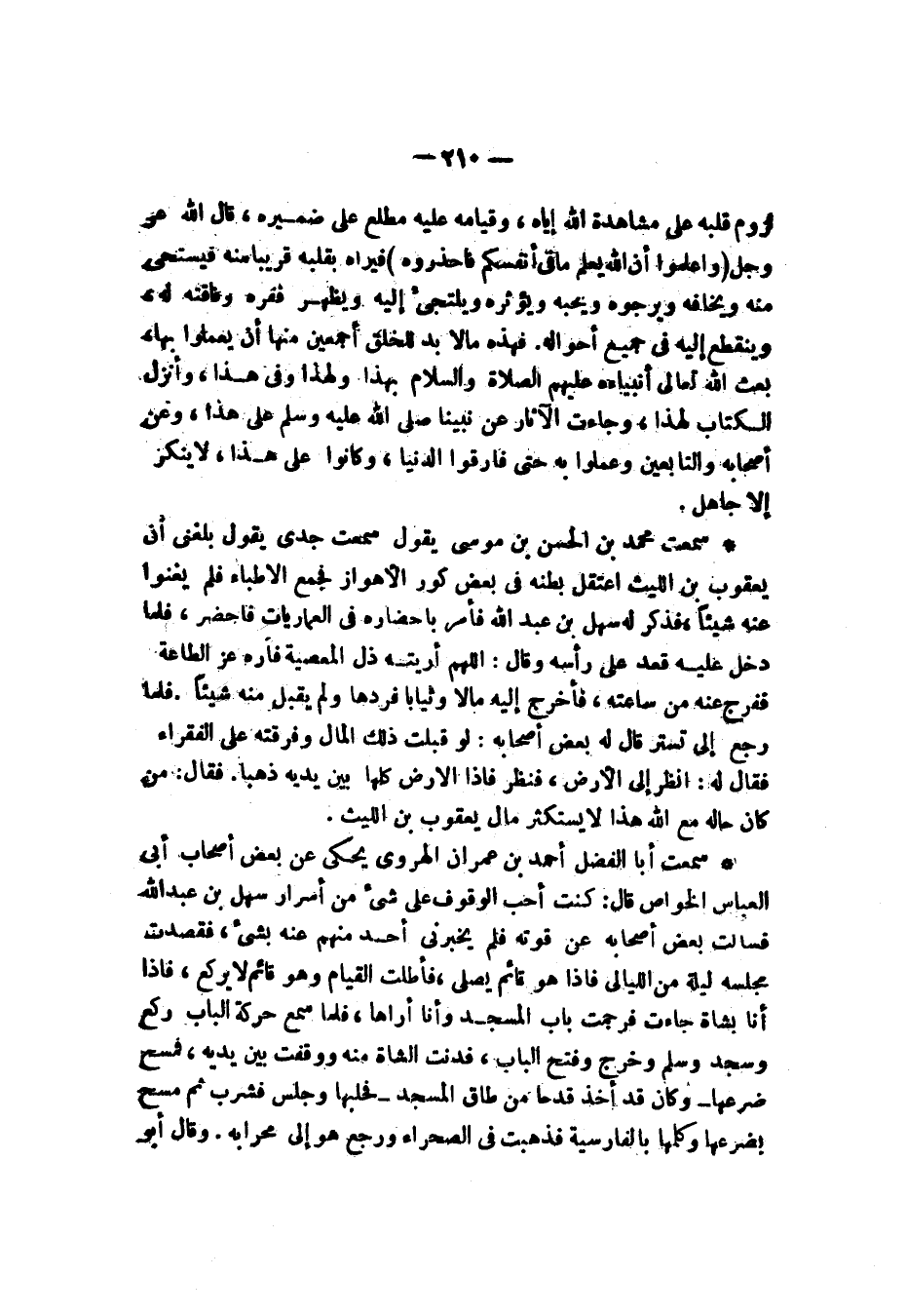 سَمِعْتُ مُحَمَّدَ بْنَ الْحَسَنِ بْنِ مُوسَى، يَقُولُ: سَمِعْتُ جَدِّيَ يَقُولُ بَلَغَنِي أَنَّ يَعْقُوبَ بْنَ اللَّيْثِ، اعْتَقَلَ بَطْنُهُ فِي بَعْضِ كُوَرِ الْأَهْوَازِ فَجَمَعَ الْأَطِبَّاءَ فَلَمْ يُغْنُوا عَنْهُ شَيْئًا فَذُكِرَ لَهُ سَهْلُ بْنُ عَبْدِ اللَّهِ فَأَمَرَ بِإِحْضَارِهِ فِي الْعَمَارِيَّاتِ فَأُحْضِرَ فَلَمَّا دَخَلَ عَلَيْهِ قَعَدَ عَلَى رَأْسِهِ وَقَالَ: §اللَّهُمَّ أَرَيْتَهُ ذُلَّ الْمَعْصِيَةِ فَأَرِهِ عَزَّ الطَّاعَةِ فَفُرِّجَ عَنْهُ مِنْ سَاعَتِهِ فَأَخْرَجَ إِلَيْهِ مَالًا وَثِيَابًا فَرَدَّهَا وَلَمْ يَقْبَلْ مِنْهُ شَيْئًا، فَلَمَّا رَجَعَ إِلَى تُسْتَرَ قَالَ لَهُ بَعْضُ أَصْحَابِهِ: لَوْ قَبِلْتَ ذَلِكَ الْمَالَ وَفَرَّقْتَهُ عَلَى الْفُقَرَاءِ فَقَالَ لَهُ: انْظُرْ إِلَى الْأَرْضِ فَنَظَرَ فَإِذَا الْأَرْضُ كُلُّهَا بَيْنَ يَدَيْهِ ذَهَبًا، فَقَالَ: مَنْ كَانَ حَالُهُ مَعَ اللَّهِ هَذَا لَا يَسْتَكْثِرُ مَالَ يَعْقُوبَ بْنِ اللَّيْثِ "