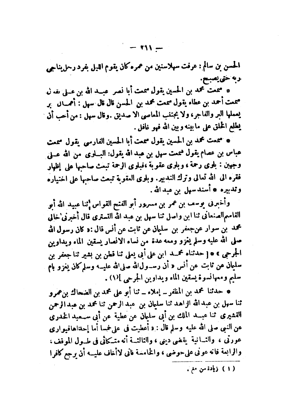سَمِعْتُ مُحَمَّدَ بْنَ الْحُسَيْنِ، يَقُولُ: سَمِعْتُ أَبَا نَصْرٍ عَبْدَ اللَّهِ بْنَ عَلِيٍّ، يَقُولُ: سَمِعْتُ أَحْمَدَ بْنَ عَطَاءٍ، يَقُولُ: سَمِعْتُ مُحَمَّدَ بْنَ الْحَسَنِ قَالَ: قَالَ سَهْلٌ: «§أَعْمَالُ الْبِرِّ يَعْمَلُهَا الْبَرُّ وَالْفَاجِرُ وَلَا يَجْتَنِبُ الْمَعَاصِي إِلَّا صِدِّيقٌ»