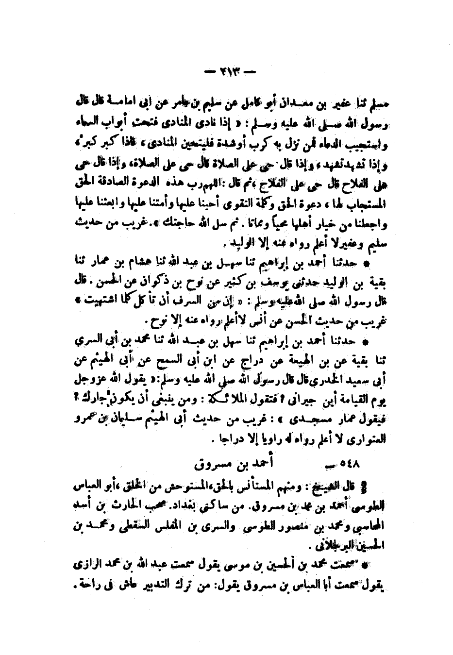 §أَحْمَدُ بْنُ مَسْرُوقٍ قَالَ الشَّيْخُ: وَمِنْهُمُ الْمُسْتَأْنِسُ بِالْحَقِّ الْمُسْتَوْحِشُ مِنَ الْخَلْقِ أَبُو الْعَبَّاسِ الطُّوسِيُّ أَحْمَدُ بْنُ مُحَمَّدِ بْنِ مَسْرُوقٍ مِنْ سَاكِنِي بَغْدَادَ صَحِبَ الْحَارِثَ بْنَ أَسَدٍ الْمُحَاسِبِيَّ وَمُحَمَّدَ بْنَ مَنْصُورٍ الطُّوسِيَّ، وَالسَّرِيَّ بْنَ الْمُغَلِّسِ السَّقَطِيَّ، وَمُحَمَّدَ بْنَ الْحُسَيْنِ الْبُرْجُلَانِيَّ