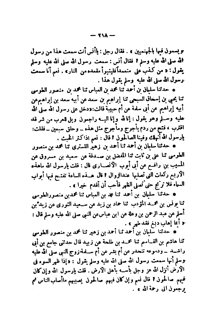 حَدَّثَنَا سُلَيْمَانُ بْنُ أَحْمَدَ، ثنا مُحَمَّدُ بْنُ الْعَبَّاسِ، ثنا مُحَمَّدُ بْنُ مَنْصُورِ الطُّوسِيُّ، ثنا يَحْيَى بْنُ إِسْحَاقَ السُّبَحِيُّ، ثنا إِبْرَاهِيمُ بْنُ سَعْدٍ، عَنْ أَبِيهِ، سَعْدِ بْنِ إِبْرَاهِيمَ، عَنْ أَبِيهِ، إِبْرَاهِيمَ، عَنْ أَبِي سَلَمَةَ، عَنْ أُمِّ حَبِيبَةَ قَالَتْ: " دَخَلَ عَلَيَّ رَسُولُ اللَّهِ صَلَّى اللهُ عَلَيْهِ وَسَلَّمَ وَهُوَ يَقُولُ: «§إِنَّا لِلَّهِ وَإِنَّا إِلَيْهِ رَاجِعُونَ وَيْلٌ لِلْعَرَبِ مِنْ شَرٍّ قَدِ اقْتَرَبَ فُتِحَ مِنْ رَدْمِ يَأْجُوجَ وَمَأْجُوجَ مِثْلُ هَذِهِ» وَحَلَّقَ بِأُصْبُعَيْنِ فَقُلْتُ: يَا رَسُولَ اللَّهِ، أَنَهْلِكُ وَفِينَا الصَّالِحُونَ؟ قَالَ: «نَعَمْ إِذَا كَثُرَ الْخَبَثُ»