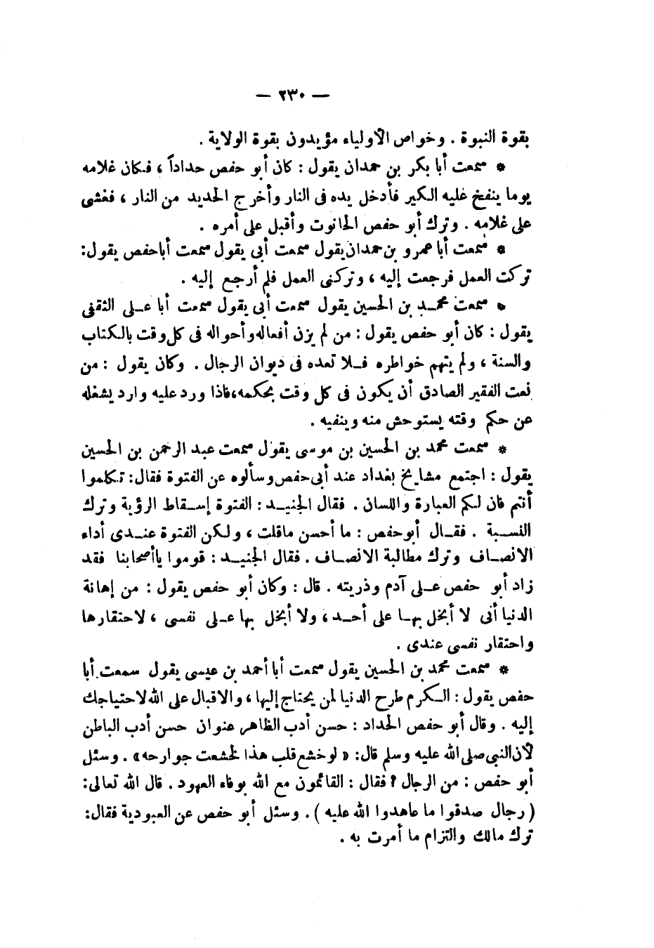 سَمِعْتُ أَبَا بَكْرِ بْنَ حَمْدَانَ، يَقُولُ: " §كَانَ أَبُو حَفْصٍ حَدَّادًا فَكَانَ غُلَامُهُ يَوْمًا يَنْفُخُ عَلَيْهِ الْكِيرَ فَأَدْخَلَ يَدَهُ فِي النَّارَ وَأَخْرَجَ الْحَدِيدَ مِنَ النَّارِ فَغُشِيَ عَلَى غُلَامِهِ، وَتَرَكَ أَبُو حَفْصٍ الْحَانُوتَ وَأَقْبَلَ عَلَى أَمْرِهِ