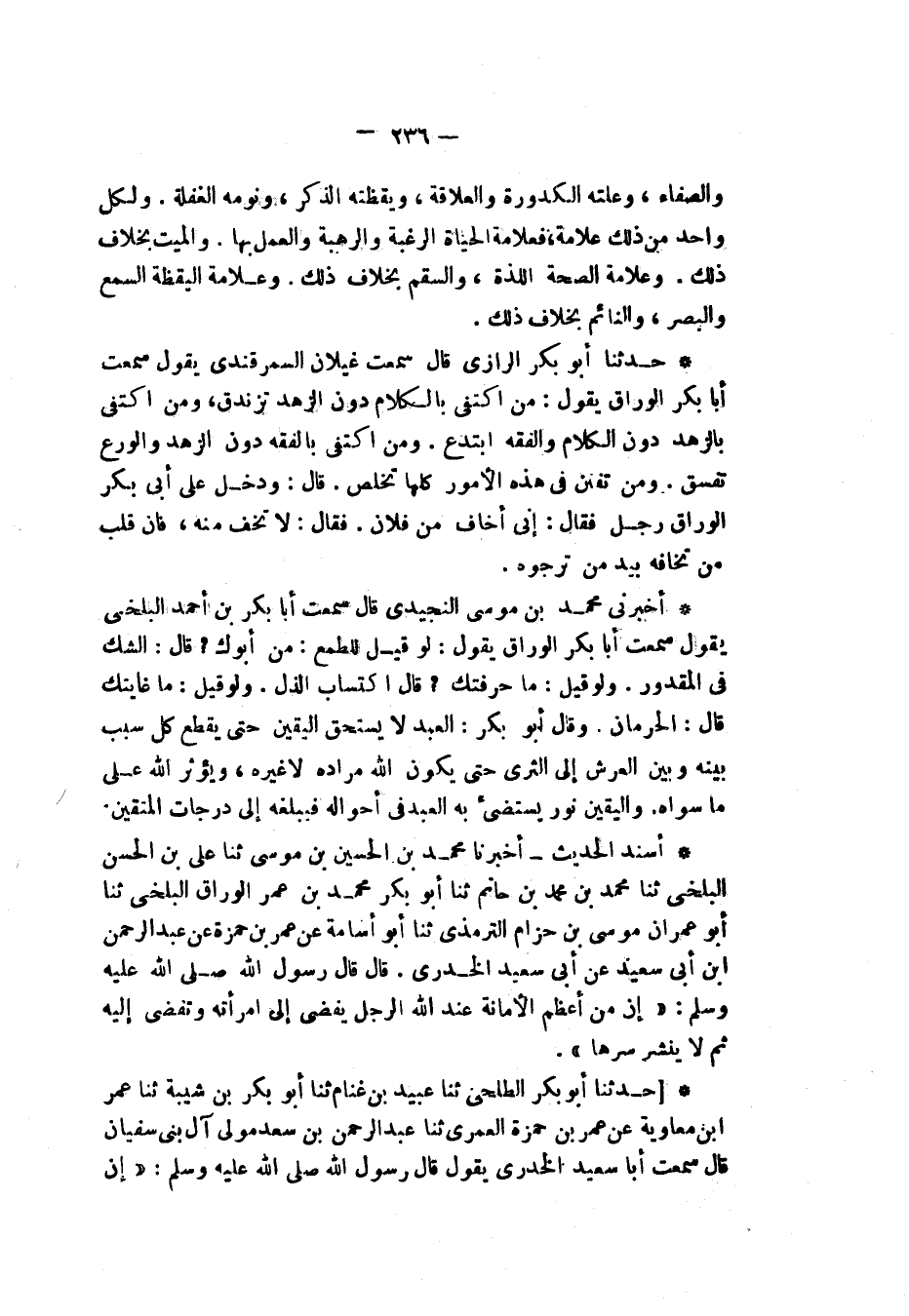 حَدَّثَنَا أَبُو بَكْرٍ الرَّازِيُّ قَالَ: سَمِعْتُ غَيْلَانَ السَّمَرْقَنْدِيَّ، يَقُولُ: سَمِعْتُ أَبَا بَكْرٍ الْوَرَّاقَ، يَقُولُ: " §مَنِ اكْتَفَى بِالْكَلَامِ دُونَ الزُّهْدِ تَزَنْدَقَ وَمَنِ اكْتَفَى بِالزُّهِدِ دُونَ الْكَلَامِ وَالْفِقْهِ ابْتَدَعَ، وَمَنِ اكْتَفَى بِالْفِقْهِ دُونَ الزُّهْدِ وَالْوَرَعِ تَفَسَّقَ، وَمَنْ تَفَنَّنَ فِي هَذِهِ الْأُمُورِ كُلِّهَا تَخَلَّصَ قَالَ: وَدَخَلَ عَلَى أَبِي بَكْرٍ الْوَرَّاقِ رَجُلٌ فَقَالَ: إِنِّي أَخَافُ مِنْ فُلَانٍ فَقَالَ: لَا تَخَفْ مِنْهُ فَإِنَّ قَلْبَ مَنْ تَخَافُهُ بِيَدِ مِنْ تَرْجُوهُ "
