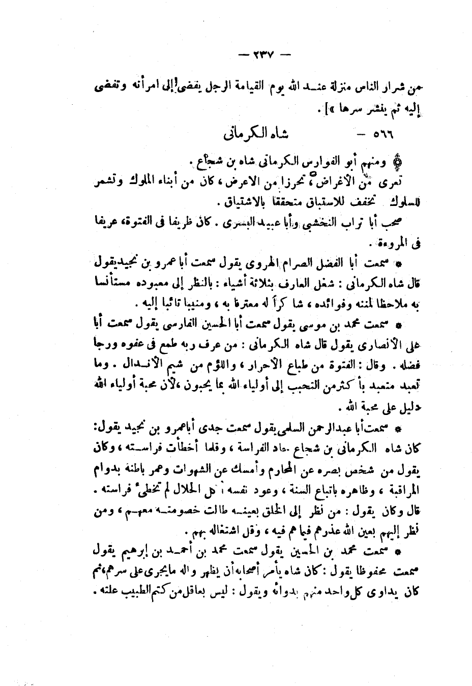 §شَاهُ الْكَرْمَانِيُّ وَمِنْهُمْ أَبُو الْفَوَارِسِ الْكَرْمَانِيُّ شَاهُ بْنُ شُجَاعٍ تَعَرَّى مِنَ الْأَغْرَاضِ تَحَرُّزًا مِنَ الْأَعْرَاضِ كَانَ مِنْ أَبْنَاءِ الْمُلُوكِ وَتَشَمَّرَ لِلسُّلُوكِ تَخَفِّفَ لِلِاسْتِبَاقِ مُتَحَقِّقًا بِالِاشْتِيَاقِ، صَحِبَ أَبَا تُرَابٍ النَّخْشَبِيَّ، وَأَبَا عُبَيْدٍ الْبُسْرِيَّ، كَانَ ظَرِيفًا فِي الْفُتُوَّةِ عَرِيفًا فِي الْمُرُوءَةِ