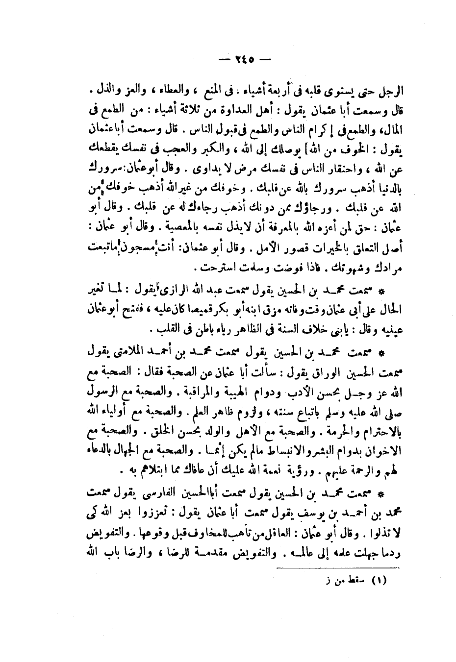سَمِعْتُ مُحَمَّدَ بْنَ الْحُسَيْنِ، يَقُولُ: سَمِعْتُ مُحَمَّدَ بْنَ أَحْمَدَ الْمَلَامَتِيَّ، يَقُولُ: سَمِعْتُ الْحُسَيْنَ الْوَرَّاقَ، يَقُولُ: سَأَلْتُ أَبَا عُثْمَانَ عَنِ الصُّحْبَةِ، فَقَالَ: «§الصُّحْبَةُ مَعَ اللَّهِ عَزَّ وَجَلَّ بِحُسْنِ الْأَدَبِ وَدَوَامِ الْهَيْبَةِ وَالْمُرَاقَبَةِ، وَالصُّحْبَةُ مَعَ الرَّسُولِ صَلَّى اللهُ عَلَيْهِ وَسَلَّمَ بِاتِّبَاعِ سُنَّتِهِ وَلُزُومِ ظَاهَرِ الْعِلْمِ، وَالصُّحْبَةُ مَعَ أَوْلِيَاءِ اللَّهِ بِالِاحْتِرَامِ وَالْحُرْمَةِ، وَالصُّحْبَةُ مَعَ الْأَهْلِ وَالْوَلَدِ بِحُسْنِ الْخُلُقِ، وَالصُّحْبَةُ مَعَ الْإِخْوَانِ بِدَوَامِ الْبِشْرِ وَالِانْبِسَاطِ مَا لَمْ يَكُنْ إِثْمًا، وَالصُّحْبَةُ مَعَ الْجُهَّالِ بِالدُّعَاءِ لَهُمْ وَالرَّحْمَةِ عَلَيْهِمْ، وَرُؤْيَةِ نِعْمَةِ اللَّهِ عَلَيْكَ أَنْ عَافَاكَ مِمَّا ابْتَلَاهُمْ بِهِ»