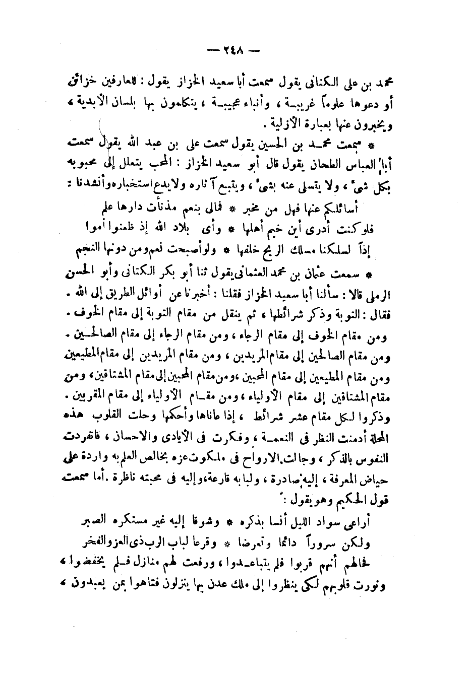 سَمِعْتُ عُثْمَانَ بْنَ مُحَمَّدٍ الْعُثْمَانِيَّ، يَقُولُ: ثنا أَبُو بَكْرٍ الْكَتَّانِيُّ، وَأَبُو الْحَسَنِ الرَّمْلِيُّ قَالَا: سَأَلْنَا أَبَا سَعِيدٍ الْخَزَّازَ فَقُلْنَا: أَخْبِرْنَا عَنْ أَوَائِلِ الطَّرِيقِ إِلَى اللَّهِ فَقَالَ: " §التَّوْبَةُ وَذِكْرُ شَرَائِطِهَا ثُمَّ يُنْقَلُ مِنِ مَقَامِ التَّوْبَةِ إِلَى مَقَامِ الْخَوْفِ، وَمِنْ مَقَامِ الْخَوْفِ إِلَى مَقَامِ الرَّجَاءِ وَمِنْ مَقَامِ الرَّجَاءِ إِلَى مَقَامِ الصَّالِحِينَ، وَمِنْ مَقَامِ الصَّالِحِينَ إِلَى مَقَامِ الْمُرِيدِينَ وَمِنْ مَقَامِ الْمُرِيدِينَ إِلَى مَقَامِ الْمُطِيعِينَ وَمِنْ مَقَامِ الْمُطِيعِينَ إِلَى مَقَامِ الْمُحِبِّينَ وَمِنْ مَقَامِ الْمُحِبِّينَ إِلَى مَقَامِ المِشْتَاقِينَ، وَمِنْ مَقَامِ المُشْتَاقِينَ إِلَى مَقَامِ الْأَوْلَيَاءِ، وَمِنْ مَقَامِ الْأَوْلَيَاءِ إِلَى مَقَامِ الْمُقَرَّبِينَ، وَذَكَرُوا لِكُلِّ مَقَامٍ عَشْرَ شَرَائِطَ إِذَا عَانَاهَا وَأَحْكَمَهَا وَحَلَّتِ الْقُلُوبُ هَذِهِ الْمَحِلَّةَ أَدْمَنَتِ النَّظَرَ فِي النِّعْمَةِ وَفَكَّرَتْ فِي الْأَيَادِي وَالْإِحْسَانِ فَانْفَرَدَتِ النُّفُوسُ بِالذِّكْرِ وَجَالَتِ الْأَرْوَاحُ فِي مَلَكُوتِ عِزِّهِ بِخَالِصِ الْعِلْمِ بِهِ وَارِدَةً عَلَى حِيَاضِ الْمَعْرِفَةِ إِلَيْهِ صَادِرَةً وَلِبَابِهِ قَارِعَةً وَإِلَيْهِ فِي مَحَبَّتِهِ نَاظِرَةً، أَمَا سَمِعْتَ قَوْلَ الْحَكِيمِ وَهُوَ يَقُولُ: