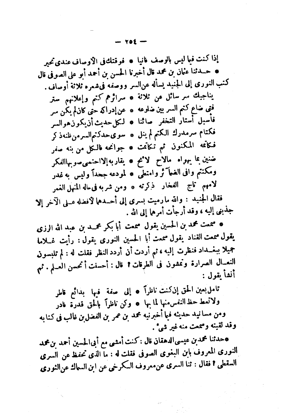 حَدَّثَنَا عُثْمَانُ بْنُ مُحَمَّدٍ قَالَ: أَخْبَرَنَا الْحَسَنُ بْنُ أَحْمَدَ أَبُو عَلِيٍّ الصُّوفِيُّ قَالَ: كَتَبَ النُّورِيُّ إِلَى الْجُنَيْدِ يَسْأَلُهُ عَنِ السِّرِّ وَوَصَفَهُ فِي شِعْرِهِ ثَلَاثَةَ أَوْصَافِ: