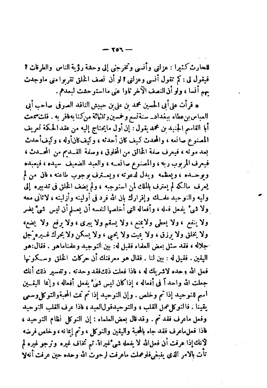 قَرَأْتُ عَلَى أَبِي الْحُسَيْنِ مُحَمَّدِ بْنِ عَلِيِّ بْنِ حُبَيْشٍ النَّاقِدِ الصُّوفِيِّ صَاحِبِ أَبِي الْعَبَّاسِ بْنِ عَطَاءٍ بِبَغْدَادَ سَنَةَ تِسْعٍ وَخَمْسِينَ وَثَلَاثِمِائَةٍ مِنْ كِتَابِهِ فَأَقَرَّ بِهِ، قُلْتُ: سَمِعْتُ أَبَا الْقَاسِمِ الْجُنَيْدَ بْنَ مُحَمَّدٍ يَقُولُ: " إِنَّ §أَوَّلَ مَا يُحْتَاجُ إِلَيْهِ مِنْ عِقْدِ الْحِكْمَةِ تَعْرِيفُ الْمَصْنُوعِ صَانِعَهُ وَالْمُحْدَثِ كَيْفَ كَانَ أَحْدَثَهُ؟ وَكَيْفَ كَانَ أَوَّلُهُ؟ وَكَيْفَ أُحْدِثَ بَعْدَ مَوْتِهِ؟ فَيَعْرِفُ صِفَةَ الْخَالِقِ مِنَ الْمَخْلُوقِ وَصِفَةَ الْقَدِيمِ مِنَ الْمُحْدَثِ، فَيَعْرِفُ الْمَرْبُوبُ رَبَّهُ وْالْمَصْنُوعُ صَانِعَهُ وَالْعَبْدُ الضَّعِيفُ سَيِّدَهُ، فَيَعْبُدُهُ وَيُوَحِّدُهُ وَيُعَظِّمُهُ وَيَذِلُّ لِدَعْوَتِهِ وَيَعْتَرِفُ بِوُجُوبِ طَاعَتِهِ فَإِنَّ مَنْ لَمْ يَعْرِفْ مَالِكَهُ لَمْ يَعْتَرِفْ بِالْمُلْكِ لِمَنِ اسْتَوْجَبَهُ وَلَمْ يُضِفِ الْخَلْقَ فِي تَدْبِيرِهِ إِلَى وَلِيِّهِ، وَالتَّوْحِيدُ عِلْمُكَ وَإِقْرَارُكَ بِأَنَّ اللَّهَ فَرْدٌ فِي أَوَّلِيَّتِهِ، وَأَزَلِيَّتِهِ لَا ثَانِيَ مَعَهُ وَلَا شَيْءَ يَفْعَلُ فِعْلَهُ وَأَفْعَالَهُ الَّتِي أَخْلَصَهَا لِنَفْسِهِ، وَأَنْ يَعْلَمَ أَنْ لَيْسَ شَيْءٌ يَضُرُّ وَلَا يَنْفَعُ وَلَا يُعْطِي وَلَا يَمْنَعُ وَلَا يُسْقِمُ وَلَا يُبْرِئُ وَلَا يَرْفَعُ وَلَا يَضَعُ وَلَا يَخْلُقُ وَلَا يَرْزُقُ وَلَا يُمِيتُ وَلَا يُحْيِي وَلَا يُسْكِنُ وَلَا يُحَرِّكُ غَيْرُهُ جَلَّ جَلَالُهُ فَقَدْ سُئِلَ بَعْضُ الْعُلَمَاءِ فَقِيلَ لَهُ: بَيِّنِ التَّوْحِيدَ وَعَلِّمْنَا مَا هُوَ؟ فَقَالَ: هُوَ الْيَقِينُ، فَقِيلَ لَهُ: بَيِّنْ لَنَا فَقَالَ: هُوَ مَعْرِفَتُكَ أَنَّ حَرَكَاتِ الْخَلْقِ وَسُكُونَهَا فِعْلُ اللَّهِ وَحْدَهُ لَا شَرِيكَ لَهُ فَإِذَا فَعَلْتَ ذَلِكَ فَقَدْ وَحَّدْتَهُ، وَتَفْسِيرُ ذَلِكَ أَنَّكَ جَعَلْتَ اللَّهَ وَاحِدًا فِي أَفْعَالِهِ إِذْ كَانَ لَيْسَ شَيْءٌ يَفْعَلُ أَفْعَالَهُ وَإِنَّمَا الْيَقِينُ اسْمٌ لِلتَّوْحِيدِ إِذَا تَمَّ وَخَلُصَ، وَإِنَّ التَّوْحِيدَ إِذَا تَمَّ تَمَّتِ الْمَحَبَّةُ وَالتَّوَكُّلُ وَسُمِّيَ يَقِينًا، فَالتَّوَكُّلُ عَمَلُ الْقَلْبِ، وَالتَّوْحِيدُ قَوْلُ الْعَبْدِ، فَإِذَا عَرَفَ الْقَلْبُ التَّوْحِيدَ وَفَعَلَ مَا عَرَفَ فَقَدْ تَمَّ، وَقَدْ قَالَ بَعْضُ الْعُلَمَاءِ: إِنَّ التَّوَكُّلَ نِظَامُ التَّوْحِيدِ فَإِذَا فَعَلَ مَا عَرَفَ فَقَدْ تَمَّ إِيمَانُهُ وَخَلُصَ فَرْضُهُ لِأَنَّكَ إِذَا عَرَفْتَ أَنَّ فِعْلَ اللَّهِ لَا يَفْعَلُهُ شَيْءً غَيْرُ اللَّهِ ثُمَّ تَخَافُ غَيْرَهُ وَتَرْجُو غَيْرَهُ لَمْ تَأْتِ بِالْأَمْرِ الَّذِي يَنْبَغِي فَلَوْ عَمِلْتَ مَا عَرَفْتَ لَرَجَوْتَ اللَّهَ وَحْدَهُ حِينَ عَرَفْتَ أَنَّهُ لَا -[257]- يَفْعَلُ فِعْلَهُ غَيْرُهُ، فَالْقَوْلُ فِيمَنْ يَقْصُرُ عِلْمُ قَلْبِهِ أَنَّهُ نَاقِصُ التَّوْحِيدِ؛ لِأَنَّ الْقَلْبَ مُشْتَغِلٌ بِالْفِتْنَةِ الَّتِي هِيَ آفَةُ التَّوْحِيدِ، قُلْتُ: قِصَرُ عِلْمِ القَلْبِ مَا هُوَ؟ قَالَ: ظَنُّكَ أَنَّ شَيْئًا يَفْعَلُ فِعْلَ اللَّهِ فَاسْمُ ذَلِكَ الظَّنِّ فِتْنَةٌ، وَالْفِتْنَةُ هِيَ الشِّرْكُ اللَّطِيفُ، قُلْتُ: أَوَلَيْسَ الْفِتْنَةُ مِنْ أَعْمَالِ الْقَلْبِ؟ قَالَ: لَا وَلَكِنَّهَا دَاخِلَةٌ عَلَيْهِ وَمُفْسِدَةٌ لَهُ، قُلْتُ: وَمَا هِيَ؟ قَالَ: ظَنُّكَ بِاللَّهِ إِذْ ظَنَنْتَ أَنَّ مَنْ يَشَاءُ يَفْعَلُ فِعْلَهُ وَالْكَلَامُ فِي هَذَا يَطُولُ وَلَكِنْ مَنْ يَفْهَمْ يَقْنَعْ بِالْيَسِيرِ "