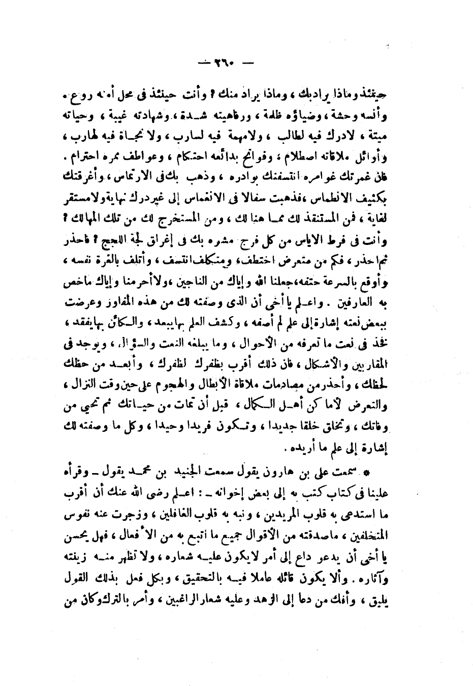 سَمِعْتُ عَلِيَّ بْنَ هَارُونَ، يَقُولُ: سَمِعْتُ الْجُنَيْدَ بْنَ مُحَمَّدٍ، يَقُولُ وَقَرَأَهُ عَلَيْنَا فِي كِتَابٍ كَتَبَ بِهِ إِلَى بَعْضِ إِخْوَانِهِ: " §اعْلَمْ رَضِيَ اللَّهُ عَنْكَ أَنَّ أَقْرَبَ مَا اسْتُدْعِيَّ بِهِ قُلُوبُ الْمُرِيدِينَ وَنُبِّهَ بِهِ قُلُوبُ الْغَافِلِينَ وَزُجِرَتْ عَنْهُ نُفُوسُ الْمُتَخَلِّفِينَ مَا صَدَقَتْهُ مِنَ الْأَقْوَالِ جَمِيعِ مَا اتَّبَعَ بِهِ مِنَ الْأَفْعَالِ، فَهَلْ يَحْسُنُ يَا أَخِي أَنْ يَدْعُوَ دَاعٍ إِلَى الْأَمْرِ لَا يَكُونُ عَلَيْهِ شِعَارُهُ وَلَا تَظْهَرُ مِنْهُ زِينَتُهُ وَآثَارُهُ، وَأَلَّا يَكُونَ قَائِلُهُ عَامِلًا فِيهِ بِالتَّحْقِيقِ، وَكُلِّ فِعْلٍ بِذَلِكَ الْقَوْلِ يَلِيقُ، وَأَفِكَ مَنْ دَعَا إِلَى الزُّهْدِ وَعَلَيْهِ شِعَارُ الرَّاغِبِينَ وَأُمِرَ بِالتَّرْكِ وَكَانَ مِنَ -[261]- الْآخِذِينَ وَأُمِرَ بِالْجِدِّ فِي الْعَمَلِ وَكَانَ مِنَ الْمُقَصِّرِينَ وَحُثَّ عَلَى الِاجْتِهَادِ وَلَمْ يَكُنْ مِنَ الْمُجْتَهِدِينَ إِلَّا قَلَّ قَبُولُ الْمُسْتَمِعِينَ لِقِيلِهِ وَنَفَرَتْ قُلُوبُهُمْ لِمَا يَرَوْنَ مِنْ فِعْلِهِ وَكَانَ حُجَّةً لِمَنْ جَعَلَ التَّأْوِيلَ سَبَبًا إِلَى اتِّبَاعِ هَوَاهُ وَمُسَهِّلًا لِسَبِيلِ مَنْ آثَرَ آخِرَتَهُ عَلَى دُنْيَاهُ، أَمَا سَمِعْتَ اللَّهَ تَعَالَى يَقُولُ وَقَدْ وَصَفَ نَبِيَّهُ شُعَيْبًا وَهُوَ شَيْخُ الْأَنْبِيَاءِ وَعَظِيمٌ مِنْ عُظَمَاءِ الرُّسُلِ وَالْأَوْلِيَاءِ وَهُوَ يَقُولُ {وَمَا أُرِيدُ أَنْ أُخَالِفَكُمْ إِلَى مَا أَنْهَاكُمْ عَنْهُ} [هود: 88]، وَقَوْلُ اللَّهِ جَلَّ ذِكْرُهُ لِمُحَمَّدٍ الْمُصْطَفَى صَلَّى اللهُ عَلَيْهِ وَسَلَّمَ: {قُلْ مَا سَأَلْتُكُمْ مِنْ أَجْرٍ} [سبأ: 47] فَهُوَ لَكُمْ، {إِنْ أَجْرِيَ إِلَّا عَلَى اللَّهِ} [يونس: 72]، وَأَمَرَ اللَّهُ لَهُ بِالدُّعَاءِ إِلَيْهِ بِقَوْلِهِ عَزَّ مِنْ قَائِلٍ {ادْعُ إِلَى سَبِيلِ رَبِّكَ بِالْحِكْمَةِ وَالْمَوْعِظَةِ الْحَسَنَةِ وَجَادِلْهُمْ بِالَّتِي هِيَ أَحْسَنُ} [النحل: 125]، فَهَذِهِ سِيرَةُ الْأَنْبِيَاءِ وَالرُّسُلِ وَالْأَوْلِيَاءِ، وَالَّذِي يَجِبُ يَا أَخِي عَلَى مَنْ فَضَّلَهُ اللَّهُ بِالْعِلْمِ بِهِ وَالْمَعْرِفَةِ لَهُ أَنْ يَعْمَلَ فِي اسْتِتْمَامِ وَاجِبَاتِ الْأَحْوَالِ وَأَنْ يُصَدِّقَ الْقَوْلَ مِنْهُ الْفِعْلُ بِذَلِكَ أَوَّلًا عِنْدَ اللَّهِ وَيَحْظَى بِهِ مَنِ اتَّبَعَهُ آخِرًا، وَاعْلَمْ يَا أَخِي أَنَّ لِلَّهَ ضَنَائِنَ مِنْ خَلْقِهِ أَوْدَعَ قُلُوبِهِمُ الْمَصُونَ مِنْ سِرِّهِ وَكَشَفَ لَهُمْ عَنْ عَظِيمِ أَثَرِهِمْ بِهِ مِنْ أَمْرِهِ فَهُمْ بِمَا اسْتَوْدَعَهُمْ مِنْ ذَلِكَ حَافِظُونَ وَبِجَلِيلِ قَدْرِ مَا أَمَّنَهُمْ عَلَيْهِ عُلَمَاءُ عَارِفُونَ، قَدْ فَتْحَ لِمَا اخْتَصَّهُمْ بِهِ مِنْ ذَلِكَ أَذْهَانَهُمْ، وَقَرَّبَ مِنْ لَطِيفِ الْفَهْمِ عَنْهُ لِمَا أَرَادَهُ أَفْهَامَهُمْ، وَرَفَعَ إِلَى مَلَكُوتِ عِزِّهِ هُمُومَهُمْ، وَقَرَّبَ مِنَ الْمَحَلِّ الْأَعْلَى بِالْإِدْنَاءِ إِلَى مَكِينِ الْإِيوَاءِ بِحُبِّهِمْ، وَأَفْرَدَ بِخَالِصِ ذِكْرِهِ قُلُوبَهُمْ فَهُمْ فِي أَقْرَبِ أَمَاكِنِ الزُّلْفَى لَدَيْهِ وَفِي أَرْفَعِ مَوَاطِنِ الْمُقْبِلِينَ بِهِ عَلَيْهِ أُولَئِكَ الَّذِينَ إِذَا نَطَقُوا فَعَنْهُ يَقُولُونَ وَإِذَا سَكَتُوا فَبِوَقَارِ الْعِلْمِ بِهِ يَصْمُتُونَ، وَإِذَا حَكَمُوا فَبِحُكْمِهِ لَهُمْ يَحْكُمُونَ، جَعَلَنَا اللَّهُ يَا أَخِي مِمَّنْ فَضَّلَهُ بِالْعِلْمِ وَمَكَّنَهُ بِالْمَعْرِفَةِ وَخَصَّهُ بِالرِّفْعَةِ وَاسْتَعْمَلَهُ بِأَكْمَلِ الطَّاعَةِ وَجَمَعَ لَهُ خَيْرَيِ الدُّنْيَا وَالْآخِرَةِ "