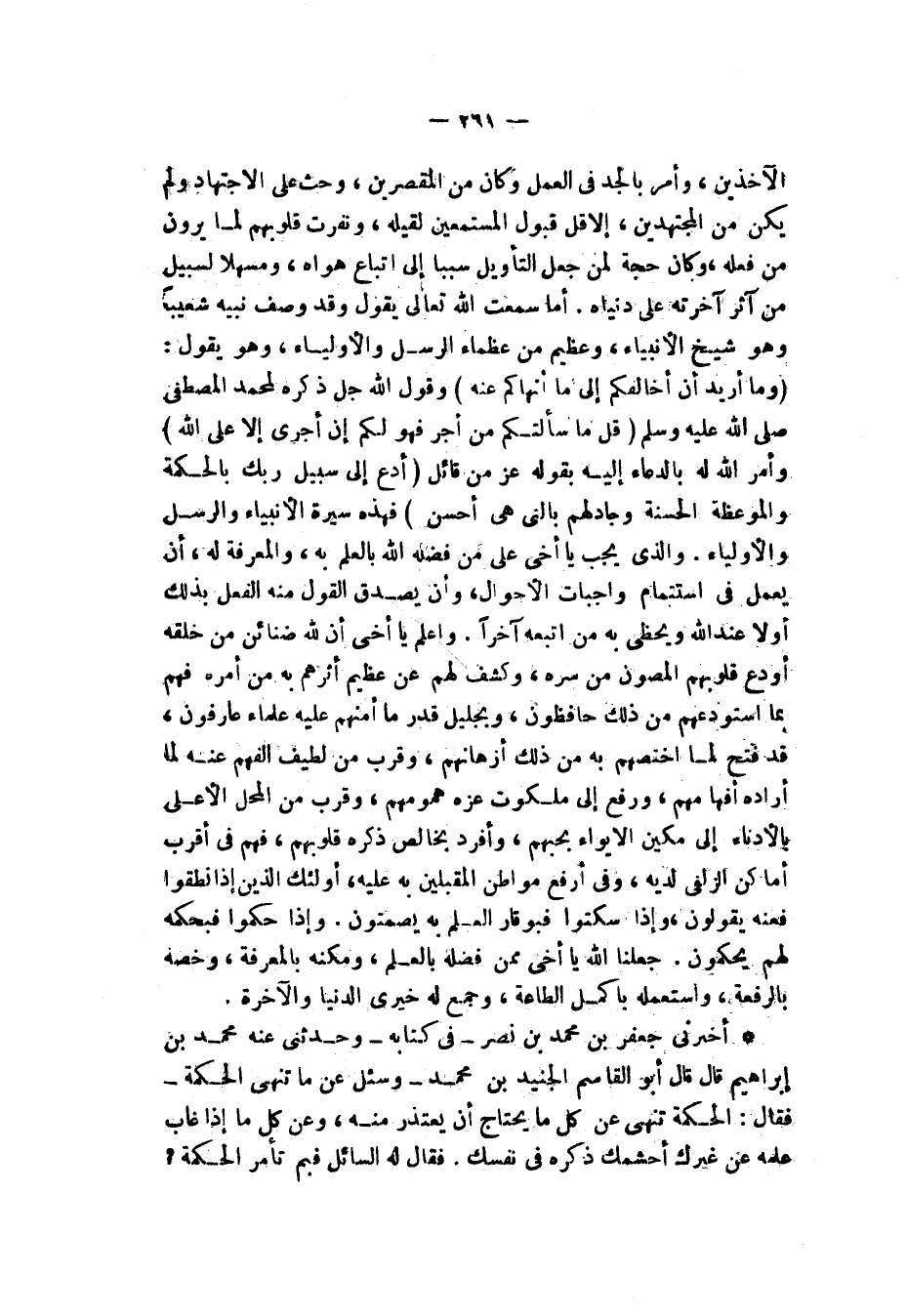 أَخْبَرَنِي جَعْفَرُ بْنُ مُحَمَّدِ بْنِ نَصْرٍ، فِي كِتَابِهِ , وَحَدَّثَنِي عَنْهُ مُحَمَّدُ بْنُ إِبْرَاهِيمَ قَالَ: قَالَ أَبُو الْقَاسِمِ الْجُنَيْدُ بْنُ مُحَمَّدٍ، وَسُئِلَ عَمَّا تَنْهَى الْحِكْمَةُ؟ فَقَالَ: " §الْحِكْمَةُ تَنْهَى عَنْ كُلِّ مَا يُحْتَاجُ أَنْ يُعْتَذَرَ مِنْهُ وَعَنْ كُلِّ مَا إِذَا غَابَ عِلْمُهُ عَنْ غَيْرِكَ، أَحْشَمَكَ ذِكْرُهُ فِي نَفْسِكَ فَقَالَ لَهُ السَّائِلُ: فَبِمَ تَأْمُرُ الْحِكْمَةُ؟ -[262]- قَالَ: تَأْمُرُ الْحِكْمَةُ بِكُلِّ مَا يُحْمَدُ فِي الْبَاقِي أَثَرُهُ وَيطِيبُ عِنْدَ جُمْلَةِ النَّاسِ خَبَرُهُ وَيُؤْمَنُ فِي الْعَوَاقِبِ ضَرَرُهُ، قَالَ: فَمَنْ يَسْتَحِقُّ أَنْ يُوصَفَ بِالْحِكْمَةِ؟ قَالَ: مَنْ إِذَا قَالَ بَلَغَ الْمَدَى وَالْغَايَةَ فِيمَا يَتَعَرَّضُ لِنَعْتِهِ بِقَلِيلِ الْقَوْلِ وَيَسِيرِ الْإِشَارَةِ وَمَنْ لَا يَتَعَذَّرُ عَلَيْهِ مِنْ ذَلِكَ شَيْءٌ مِمَّا يُرِيدُ؛ لِأَنَّ ذَلِكَ عِنْدَهُ حَاضِرٌ عَتِيدٌ، قَالَ: فَبِمَنْ تَأْنَسُ الْحِكْمَةُ؟ وَإِلَى مَنْ تَسْتَرِيحُ وَتَأْوِي؟ قَالَ: إِلَى مَنِ انْحَسَمَتْ عَنِ الْكُلِّ مَطَامِعُهُ وَانْقَطَعَتْ مِنَ الْفَضْلِ فِي الْحَاجَاتِ مُطَالِبُهُ وَمَنِ اجْتَمَعَتْ هُمُومُهُ وَحَرَكَاتُهُ فِي ذَاتِ رَبِّهِ وَمَنْ عَادَتْ مَنَافِعُهُ عَلَى سَائِرِ أَهْلِ دَهْرِهِ "