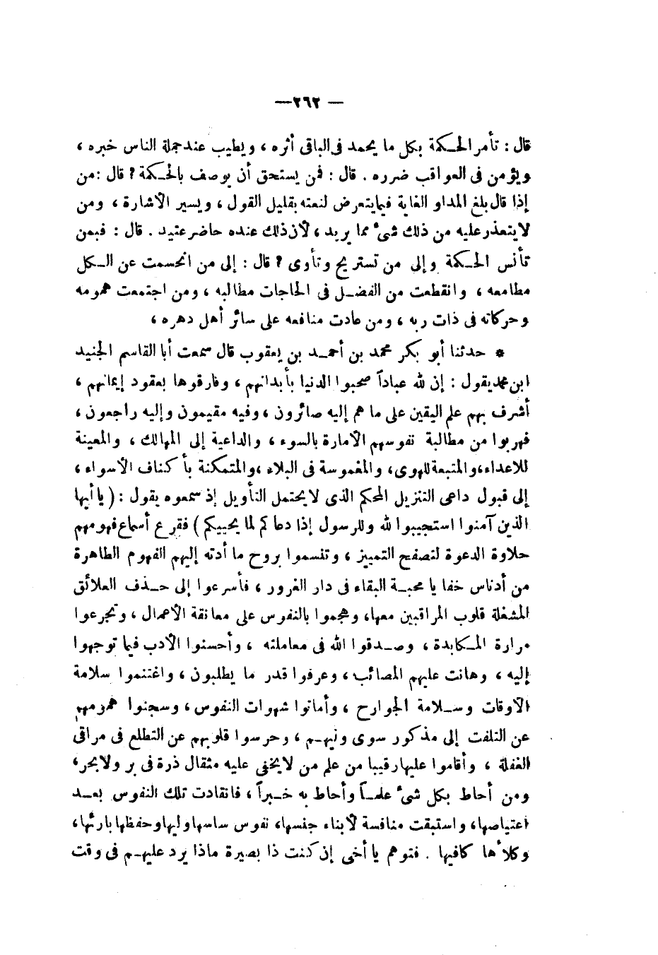 حَدَّثَنَا أَبُو بَكْرٍ مُحَمَّدُ بْنُ أَحْمَدَ بْنِ يَعْقُوبَ قَالَ: سَمِعْتُ أَبَا الْقَاسِمِ الْجُنَيْدَ بْنَ مُحَمَّدٍ، يَقُولُ: " إِنَّ §لِلَّهِ عِبَادًا صَحِبُوا الدُّنْيَا بِأَبْدَانِهِمْ وَفَارَقُوهَا بِعُقُودِ أَيْمَانِهِمْ أَشْرَفَ بِهِمْ عِلْمُ الْيَقِينِ عَلَى مَا هُمْ إِلَيْهِ صَائِرُونَ وَفِيهِ مُقِيمُونَ وَإِلَيْهِ رَاجِعُونَ فَهَرَبُوا مِنْ مُطَالَبَةِ نُفُوسِهِمُ الْأَمَّارَةِ بِالسُّوءِ وَالدَّاعِيَةِ إِلَى الْمَهَالِكِ وَالْمُعِينَةِ لِلْأَعْدَاءِ وَالْمُتَّبِعَةِ لِلْهَوَى وَالْمَغْمُوسَةِ فِي الْبَلَاءِ وَالْمُتَمَكِّنَةِ بِأَكْنَافِ الْأَسْوَاءِ إِلَى قَبُولِ دَاعِي التَّنْزِيلِ الْمُحْكَمِ الَّذِي لَا يَحْتَمِلُ التَّأْوِيلَ إِذْ سَمِعُوهُ يَقُولُ: {يَا أَيُّهَا الَّذِينَ آمَنُوا اسْتَجِيبُوا لِلَّهِ وَلِلرَّسُولِ إِذَا دَعَاكُمْ لِمَا يُحْيِيكُمْ} [سورة: الأنفال، آية رقم: 24] فَقَرَعَ أَسْمَاعَ فُهُومِهِمْ حَلَاوَةُ الدَّعْوَةِ لِتَصَفُّحِ التَّمْيِيزِ، وَتَنَسَّمُوا بِرَوْحِ مَا أَدَّتْهُ إِلَيْهِمُ الْفُهُومُ الطَّاهِرَةُ مِنْ أَدْنَاسِ خَفَايَا مَحَبَّةِ الْبَقَاءِ فِي دَارِ الفَنَاءِ فَأَسْرَعُوا إِلَى حَذْفِ الْعَلَائِقِ الْمُشْغِلَةِ قُلُوبَ الْمُرَاقِبِينَ مَعَهَا، وَهَجَمُوا بِالنُّفُوسِ عَلَى مُعَانَقَةِ الْأَعْمَالِ وَتَجَرَّعُوا مَرَارَةَ الْمُكَابَدَةِ وَصَدَقُوا اللَّهَ فِي مُعَامَلَتِهِ، وَأَحْسَنُوا الْأَدَبَ فِيمَا تَوَجَّهُوا إِلَيْهِ وَهَانَتْ عَلَيْهِمُ الْمَصَائِبُ وَعَرَفُوا قَدْرَ مَا يَطْلُبُونَ، وَاغْتَنَمُوا سَلَامَةَ الْأَوْقَاتِ وَسَلَامَةَ الْجَوَارِحِ وَأَمَاتُوا شَهَوَاتِ النُّفُوسِ وَسَجَنُوا هُمُومَهُمْ عَنِ التَّلَفُّتِ إِلَى مَذْكُورٍ سِوَى وَلِيِّهِمْ، وَحَرَسُوا قُلُوبِهِمْ عَنِ التَّطَلُّعِ فِي مَرَاقِي الْغَفْلَةِ، وَأَقَامُوا عَلَيْهَا رَقِيبًا مِنْ عِلْمِ مَنْ لَا يَخْفَى عَلَيْهِ مِثْقَالُ ذَرَّةٍ فِي بَرٍّ وَلَا بَحْرٍ وَمَنْ أَحَاطَ بِكُلِّ شَيْءٍ عِلْمًا وَأَحَاطَ بِهِ خُبْرًا فَانْقَادَتْ تِلْكَ النُّفُوسُ بَعْدَ اعْتِيَاصِهَا، وَاسْتَبَقَتْ مُنَافِسَةً لِأَبْنَاءِ جِنْسِهَا نُفُوسٌ سَاسَهَا وَلِيُّهَا وَحَفِظَهَا بَارِئُهَا وَكَلَأَهَا كَافِيهَا، فَتَوَهَّمْ يَا أَخِي إِنْ كُنْتَ ذَا بَصِيرَةٍ مَاذَا يَرِدُ عَلَيْهِمْ فِي وَقْتِ -[263]- مُنَاجَاتِهِمْ؟ وَمَاذَا يَلْقَوْنَهُ مِنْ نَوَازِلِ حَاجَاتِهِمْ؟ تَرَ أَرْوَاحًا تَتَرَدَّدُ فِي أَجْسَادٍ قَدْ أَذْبَلَتْهَا الْخَشْيَةُ وَذَلَّلَتْهَا الْخِدْمَةُ وَتَسَرْبَلَهَا الْحَيَاءُ وَجَمَعَهَا الْقُرْبُ وَأَسْكَنَهَا الْوَقَارُ وَأَنْطَقَهَا الْحِذَارُ، أَنِيسُهَا الْخَلْوَةُ وَحِدِيثُهَا الْفِكْرَةُ وَشِعَارُهَا الذِّكْرُ، شُغْلُهَا بِاللَّهِ مُتَّصِلٌ وَعَنْ غَيْرِهِ مُنْفَصِلٌ، لَا تَتَلَقَّى قَادِمًا وَلَا تُشَيِّعُ ظَاعِنًا، غِذَاؤُهَا الْجُوعُ وَالظَّمَأُ وَرَاحَتُهَا التَّوَكُّلُ وَكَنْزُهَا الثِّقَةُ بِاللَّهِ وَمِعْوَلُهَا الِاعْتِمَادُ وَدَوَاؤُهَا الصَّبْرُ وَقَرِينُهَا الرِّضَا، نُفُوسٌ قُدِّمَتْ لِتَأْدِيَةِ الْحُقُوقِ وَرُقِّيَتْ لِنَفِيسِ الْعِلْمِ الْمَخْزُونِ وَكُفِيَتْ ثِقَلَ الْمِحَنِ: {لَا يَحْزُنُهُمُ الْفَزَعُ الْأَكْبَرُ وَتَتَلَقَّاهُمُ الْمَلَائِكَةُ هَذَا يَوْمُكُمُ الَّذِي كُنْتُمْ تُوعَدُونَ} [سورة: الأنبياء، آية رقم: 103]، {نَحْنُ أَوْلِيَاؤُكُمْ فِي الْحَيَاةِ الدُّنْيَا وَفِي الْآخِرَةِ وَلَكُمْ فِيهَا مَا تَشْتَهِي أَنْفُسُكُمْ وَلَكُمْ فِيهَا مَا تَدَّعُونَ نُزُلًا مِنْ غَفُورٍ رَحِيمٍ} [سورة: فصلت، آية رقم: 32] "