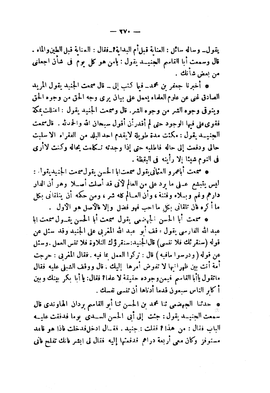 قَالَ: سَمِعْتُ الْجُنَيْدَ يَقُولُ: «§مَكَثْتُ مُدَّةً طَوِيلَةً لَا يَقْدَمُ أَحَدٌ الْبَلَدَ مِنَ الْفُقَرَاءِ إِلَّا سُلِبْتُ حَالِي وَدُفِعْتُ إِلَى حَالِهِ فَأَطْلُبُهُ حَتَّى إِذَا وَجَدْتُهُ تَكَلَّمْتُ بِحَالِهِ وَكُنْتُ لَا أَرَى فِي النَّوْمِ شَيْئًا إِلَّا رَأَيْتُهُ فِي الْيَقَظَةِ»