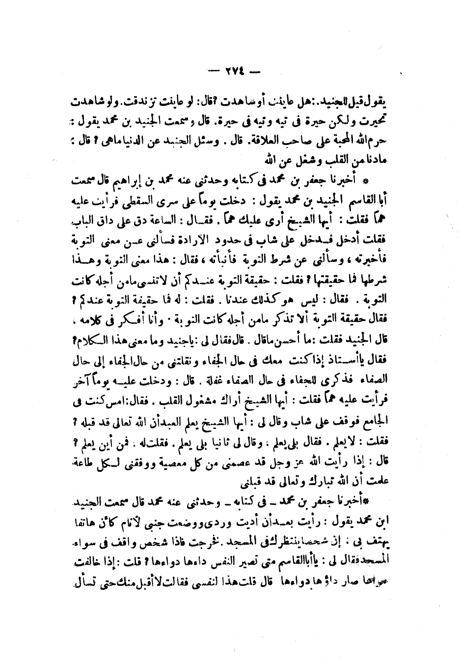 أَخْبَرَنَا جَعْفَرُ بْنُ مُحَمَّدٍ، فِي كِتَابِهِ، وَحَدَّثَنِي عَنْهُ مُحَمَّدُ بْنُ إِبْرَاهِيمَ قَالَ: سَمِعْتُ أَبَا الْقَاسِمِ الْجُنَيْدَ بْنَ مُحَمَّدٍ، يَقُولُ: " §دَخَلْتُ يَوْمًا عَلَى سَرِيٍّ السَّقَطَيِّ فَرَأَيْتُ عَلَيْهِ هَمًّا فَقُلْتُ: أَيُّهَا الشَّيْخُ أَرَى عَلَيْكَ هَمًّا فَقَالَ: السَّاعَةَ دَقَّ عَلَيَّ دَاقٌّ الْبَابَ فَقُلْتُ: ادْخُلْ، فَدَخَلَ عَلَيَّ شَابٌّ فِي حُدُودِ الْإِرَادَةِ فَسَأَلَنِي عَنْ مَعْنَى التَّوْبَةِ، فَأَخْبَرْتُهُ وَسَأَلَنِي عَنْ شَرْطِ التَّوْبَةِ، فَأَنْبَأْتُهُ فَقَالَ: هَذَا مَعْنَى التَّوْبَةِ وَهَذَا شَرْطُهَا، فَمَا حَقِيقَتُهَا؟ فَقُلْتُ: حَقِيقَةُ التَّوْبَةِ عِنْدَكُمْ أَنْ لَا تَنْسَى مَا مِنْ أَجْلِهِ كَانَتِ التَّوْبَةُ فَقَالَ: لَيْسَ هُوَ كَذَلِكَ عِنْدَنَا، فَقُلْتُ لَهُ: فَمَا حَقِيقَةُ التَّوْبَةِ عِنْدَكُمْ؟ فَقَالَ: حَقِيقَةَ التَّوْبَةِ أَلَا تَذْكُرَ مَا مِنْ أَجْلِهِ كَانَتِ التَّوْبَةُ، وَأَنَا أَفَكِّرُ فِي كَلَامِهِ، قَالَ الْجُنَيْدُ: فَقُلْتُ: مَا أَحْسَنَ مَا قَالَ، قَالَ: فَقَالَ لِي: يَا جُنَيْدُ، وَمَا مَعْنَى هَذَا الْكَلَامِ؟ فَقَالَ: يَا أَسْتَاذُ إِذَا كُنْتُ مَعَكَ فِي حَالِ الْجَفَاءِ وَنَقَلْتَنِي مِنْ حَالِ الْجَفَاءِ إِلَى حَالِ الصَّفَاءِ فَذِكْرِي لِلْجَفَاءِ فِي حَالِ الصَّفَاءِ غَفْلَةٌ، قَالَ: وَدَخَلْتُ عَلَيْهِ يَوْمًا آخَرَ فَرَأَيْتُ عَلَيْهِ هَمًّا فَقُلْتُ: أَيُّهَا الشَّيْخُ أَرَاكَ مَشْغُولَ الْقَلْبِ، فَقَالَ: أَمْسِ كُنْتُ فِي الْجَامِعِ فَوَقَفَ عَلَيَّ شَابٌّ وَقَالَ لِي: أَيُّهَا الشَّيْخُ، أَيَعْلَمُ الْعَبْدُ أَنَّ اللَّهَ تَعَالَى قَدْ قَبِلَهُ؟ فَقُلْتُ: لَا يَعْلَمُ، فَقَالَ: بَلَى يَعْلَمُ، وَقَالَ لِي ثَانِيًا: بَلَى يَعْلَمُ، فَقُلْتُ لَهُ: فَمِنْ أَيْنَ يَعْلَمُ؟ قَالَ: إِذَا رَأَيْتُ اللَّهَ عَزَّ وَجَلَّ قَدْ عَصَمَنِي مِنْ كُلِّ مَعْصِيَةٍ وَوَفَّقَنِي لِكُلِّ طَاعَةٍ عَلِمْتُ أَنَّ اللَّهَ تَبَارَكَ وَتَعَالَى قَدْ قَبِلَنِي "