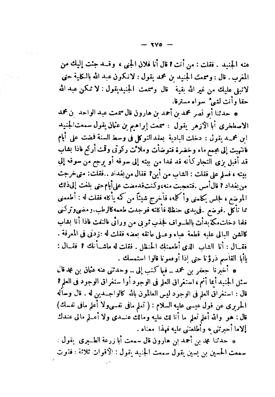 حَدَّثَنَا أَبُو نَصْرٍ مُحَمَّدُ بْنُ أَحْمَدَ بْنِ هَارُونَ قَالَ: سَمِعْتُ عَبْدَ الْوَاحِدِ بْنَ مُحَمَّدٍ الْإِصْطَخْرِيَّ أَبَا الْأَزْهَرِ، يَقُولُ: سَمِعْتُ إِبْرَاهِيمَ بْنَ عُثْمَانَ، يَقُولُ: سَمِعْتُ الْجُنَيْدَ بْنَ مُحَمَّدٍ، يَقُولُ: " §دَخَلْتُ الْبَادِيَةَ بِعَقْدِ التَّوَكُّلِ فِي وَسَطِ السَّنَةِ فَمَضَتْ عَلَيَّ أَيَّامٌ فَانْتَهَيْتُ إِلَى مَجْمَعِ مَاءٍ وَخُضْرَةٍ فَتَوَضَّأْتُ وَمَلَأْتُ رِكْوَتِي وَقُمْتُ أَرْكَعُ فَإِذَا بِشَابٍّ قَدْ أَقْبَلَ بِزِيِّ التُّجَّارِ كَأَنَّهُ قَدْ غَدَا مِنْ بَيْتِهِ إِلَى سُوقِهِ أَوْ يَرْجِعُ مِنْ سُوقِهِ إِلَى بَيْتِهِ فَسَلَّمَ عَلَيَّ فَقُلْتُ: الشَّابُّ مُنْ أَيْنَ؟ فَقَالَ: مِنْ بَغْدَادَ، فَقُلْتُ: مَتَى خَرَجْتَ مِنْ بَغْدَادَ؟ قَالَ: أَمْسِ، فَتَعَجَّبْتُ مِنْهُ وَكُنْتُ قَدْ مَضَتْ عَلَيَّ أَيَّامٌ حَتَّى بَلَغْتُ إِلَى ذَلِكَ الْمَوْضِعِ فَجَلَسَ يُكَلِّمُنِي وَأُكَلِّمُهُ فَأَخْرَجَ شَيْئًا مِنْ كُمِّهِ يَأْكُلُهُ فَقُلْتُ لَهُ: أَطْعِمْنِي مِمَّا تَأْكُلُ، فَوَضَعَ فِي يَدِي حَنْظَلَةً فَأَكَلْتُهُ فَوَجَدْتُ طَعْمَهُ كَالرُّطَبِ، وَمَضَى وَتَرَكَنِي فَلَمَّا دَخَلْتُ مَكَّةَ بَدَأْتُ بِالطَّوَافِ فَجَذَبَ ثَوْبِي مِنْ وَرَائِي فَالْتَفَتُّ فَإِذَا أَنَا بِشَابٍّ كَالشَّنِّ الْبَالِي عَلَيْهِ قِطْعَةُ عَبَاءٍ وَعَلَى عَاتِقِهِ بَعْضُهُ فَقُلْتُ لَهُ: زِدْنِي فِي الْمَعْرِفَةِ، فَقَالَ: أَنَا الشَّابُّ الَّذِي أَطْعَمْتُكَ الْحَنْظَلَ، فَقُلْتُ لَهُ: مَا شَأْنُكَ؟ فَقَالَ: يَا أَبَا الْقَاسِمِ ذَرَءُونَا حَتَّى أَوْقَعُونَا، قَالُوا: اسْتَمْسِكْ "