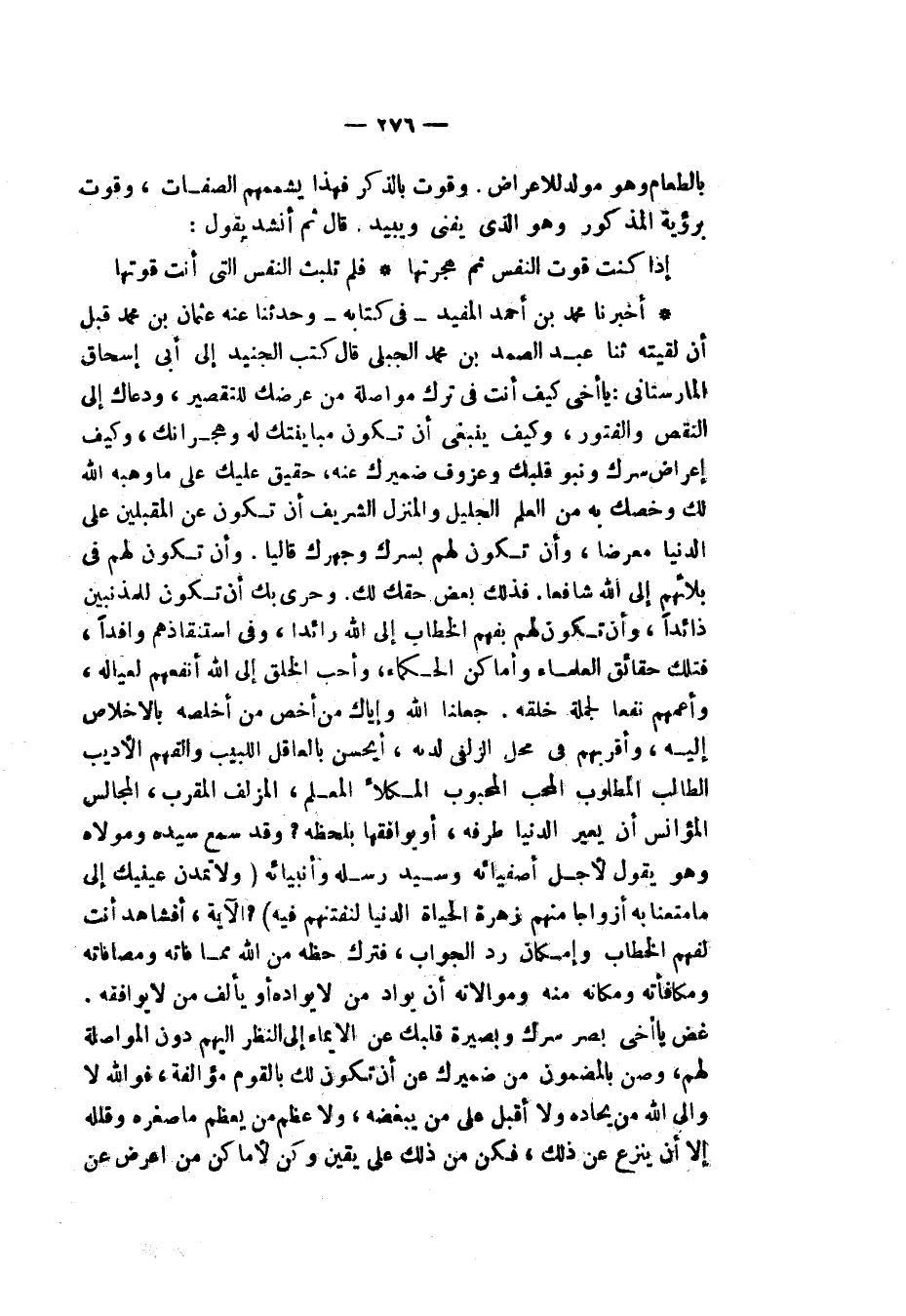 أَخْبَرَنَا مُحَمَّدُ بْنُ أَحْمَدَ الْمُفِيدُ، فِي كِتَابِهِ , وَحَدَّثَنَا عَنْهُ عُثْمَانُ بْنُ مُحَمَّدٍ، قَبْلَ أَنْ لَقِيتُهُ، ثنا عَبْدُ الصَّمَدِ بْنُ مُحَمَّدٍ الْجَبَلِيُّ قَالَ: كَتَبَ الْجُنَيْدُ إِلَى أَبِي إِسْحَاقَ الْمَارِسْتَانِيُّ: " يَا أَخِي، §كَيْفَ أَنْتَ فِي تَرِكْ مُوَاصَلَةِ مَنْ عَرَّضَكَ لِلتَّقْصِيرِ وَدَعَاكَ إِلَى النَّقْصِ وَالْفُتُورِ؟ وَكَيْفَ يَنْبَغِي أَنْ تَكُونَ مُبَايَنَتُكَ لَهُ وَهُجْرَانُكَ؟ وَكَيْفَ إِعْرَاضُ سِرِّكَ وَنُبُوُّ قَلْبِكَ وَعُزُوفُ ضَمِيرِكَ عَنْهُ؟ حَقِيقٌ عَلَيْكَ عَلَى مَا وَهَبَهُ اللَّهُ لَكَ، وَخَصَّكَ بِهِ مِنَ الْعِلْمِ الْجَلِيلِ وَالْمُنْزِلِ الشَّرِيفِ أَنْ تَكُونَ عَنِ الْمُقْبِلِينَ عَلَى الدُّنْيَا مُعْرِضًا وَأَنْ تَكُونَ لَهُمْ بِسِرِّكَ وَجَهْرِكَ قَالِيًا، وَأَنْ تَكُونَ لَهُمْ فِي بَلَائِهِمْ إِلَى اللَّهِ شَافِعًا، فَذَلِكَ بَعْضُ حَقِّكَ لَكَ وَحَرِيٌّ بِكَ أَنْ تَكُونَ لِلْمُذْنِبِينَ ذَائِدًا وَأَنْ تَكُونَ لَهُمْ بِفَهْمِ الْخِطَابِ إِلَى اللَّهِ رَائِدًا وَفِي اسْتِنْقَاذِهِمْ وَافِدًا فَتِلْكَ حَقَائِقُ الْعُلَمَاءِ وَأَمَاكِنُ الْحُكَمَاءِ وَأَحَبُّ الْخَلْقِ إِلَى اللَّهِ أَنْفَعُهُمْ لِعِيَالِهِ، وَأَعَمُّهُمْ نَفْعًا لِجُمْلَةِ خَلْقِهِ، جَعَلَنَا اللَّهُ وَإِيَّاكَ مِنْ أَخَصِّ مَنْ أَخْلَصَهُ بِالْإِخْلَاصِ إِلَيْهِ وَأَقْرَبِهِمْ فِي مَحَلِّ الزُّلْفَى لَدَيْهِ أَيَحْسُنُ بِالْعَاقلِ اللَّبِيبِ وَالْفَهِمِ الْأَدِيبِ الطَّالِبِ الْمَطْلُوبِ الْمُحِبِّ الْمَحْبُوبِ الْمُكْلَأِ الْمُعَلَّمِ، الْمُزَلَّفِ الْمُقَرَّبِ الْمَجَالِسِ الْمُؤَانِسِ أَنْ يُعِيرَ الدُّنْيَا طَرْفَهُ أَوْ يوَافِقَهَا بِلَحْظِهِ وَقَدْ سَمِعَ سَيِّدَهُ وَمَوْلَاهُ وَهُوَ يَقُولُ لِأَجَلِّ أَصْفِيَائِهِ وَسَيِّدِ رُسُلِهِ وَأَنْبِيَائِهِ: {وَلَا تُمُدَّنَّ عَيْنَيْكَ إِلَى مَا مَتَّعْنَا بِهِ أَزْوَاجًا مِنْهُمْ زُهْرَةَ الْحَيَاةِ الدُّنْيَا لِنِفْتِنَهُمْ فِيهِ} [طه: 131]، الْآيَةَ، أَفَشَاهِدٌ أَنْتَ لِفَهْمِ الْخِطَابِ وَإِمْكَانِ رَدِّ الْجَوَّابِ؟ فَتَرَكَ حَظَّهُ مِنَ اللَّهِ مِمَّا فَاتَهُ، وَمُصَافَاتُهُ وَمُكَافَأَتُهُ وَمَكَانُهُ مِنْهُ وَمُوَالَاتُهُ أَنْ يُوَادَّ مَنْ لَا يُوَادُّهُ أَوْ يَأْلَفَ مَنْ لَا يُوَافِقُهُ، غُضَّ يَا أَخِي بَصَرَ سِرِّكَ وَبَصِيرَةَ قَلْبِكَ عَنِ الْإِيمَاءِ إِلَى النَّظَرِ إِلَيْهِمْ دُونَ الْمُوَاصَلَةِ لَهُمْ وَصُنْ بِالْمَضْمُونِ مِنْ ضَمِيرِكَ عَنْ أَنْ تَكُونَ لَكَ بِالْقَوْمِ مُؤَالَفَةٌ، فَوَاللَّهِ لَا وَالَى اللَّهُ مَنْ يُحَادُّهُ وَلَا أَقْبَلَ عَلَى مَنْ يُبْغِضُهُ وَلَا عَظَّمَ مَنْ يُعَظِّمُ مَا صَغَّرَهُ وَقَلَّلَهُ إِلَّا أَنْ يَنْزِعَ عَنْ ذَلِكَ فَكُنْ مِنْ ذَلِكَ عَلَى يَقِينٍ وَكُنْ لِأَمَاكِنِ مَنْ أَعْرَضَ عَنِ -[277]- الْحَقِّ مُسْتَهِينًا، وَبَعْدُ يَا أَخِي فَتَفَضَّلْ بِاحْتِمَالِي إِنْ غَلُظَ عَلَيْكَ مَقَالِي وَتَجَشَّمِ الصَّبْرَ عَلَى أَنْ يُوَافِقَ قَلْبُكَ مَا فِي كِتَابِي فَإِنَّ الْمُنَاصَحَةَ وَالْمُفَاصَحَةَ خَيْرٌ مِنَ الْإِغْضَاءِ مَعَ الْمُتَارَكَةِ وَإِنِّي أَخْتِمُ كِتَابِي وَأَسْتَدْعِي جَوَابِي بِقَوْلِي: الْحَمْدُ لِلَّهِ الَّذِي هَدَانَا لِهَذَا وَمَا كُنَّا لِنَهْتَدِيَ لَوْلَا أَنْ هَدَانَا اللَّهُ، وَصَلَّى اللَّهُ عَلَى سَيِّدِنَا مُحَمَّدٍ الْمُصْطَفَى وَعَلَى آلِهِ وَسَلَّمَ تَسْلِيمًا كَثِيرًا "