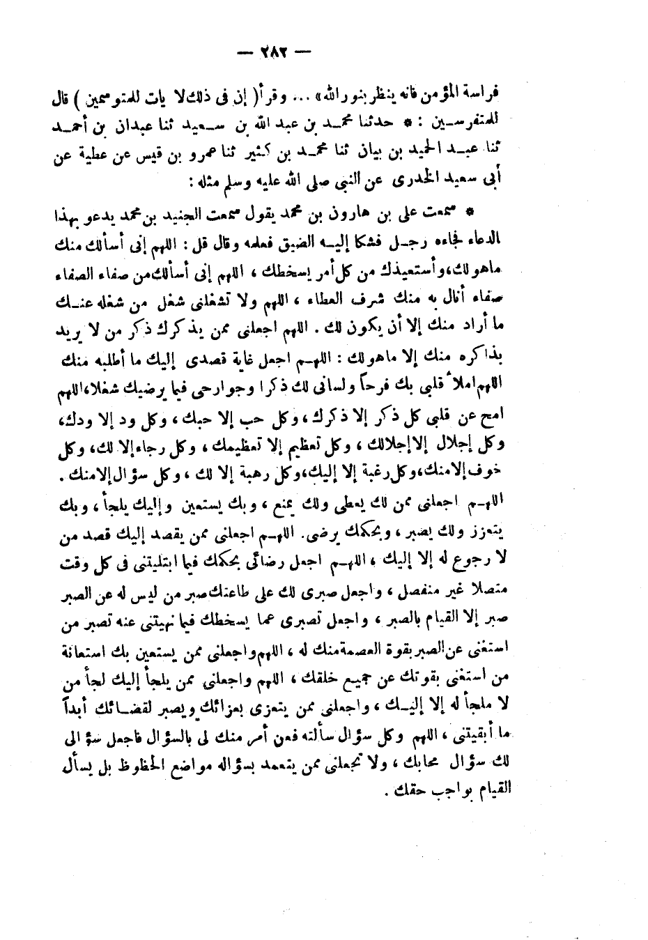 سَمِعْتُ عَلِيَّ بْنَ هَارُونَ بْنِ مُحَمَّدٍ، يَقُولُ: سَمِعْتُ الْجُنَيْدَ بْنَ مُحَمَّدٍ، يَدْعُو بِهَذَا الدُّعَاءِ فَجَاءَهُ رَجُلٌ فَشَكَا إِلَيْهِ الضِّيقَ فَعَلَّمَهُ وَقَالَ: قُلِ: «§اللَّهُمَّ إِنِّي أَسْأَلُكَ مِنْكَ مَا هُوَ لَكَ وَأَسْتَعِيذُكَ مِنْ كُلِّ أَمْرٍ يُسْخِطُكَ اللَّهُمَّ إِنِّي أَسْأَلُكَ مِنْ صَفَاءِ الصَّفَاءِ صَفَاءً أَنَالُ بِهِ مِنْكَ شَرَفَ الْعَطَاءِ اللَّهُمَّ وَلَا تَشْغَلْنِي شُغُلَ مَنْ شَغَلَهُ عَنْكَ مَا أَرَادَ مِنْكَ إِلَّا أَنْ يَكُونَ لَكَ، اللَّهُمَّ اجْعَلْنِي مِمَّنْ يَذْكُرُكَ ذِكْرَ مَنْ لَا يُرِيدُ بِذَاكِرِهِ مِنْكَ إِلَّا مَا هُوَ لَكَ، اللَّهُمَّ اجْعَلْ غَايَةَ قَصْدِي إِلَيْكَ مَا أَطْلُبُهُ مِنْكَ اللَّهُمَّ أَمْلَأْ قَلْبِي بِكَ فَرَحًا وَلِسَانِي لَكَ ذِكْرًا وَجَوَارِحِي فِيمَا يُرْضِيكَ شُغُلًا اللَّهُمَّ امْحُ عَنْ قَلْبِيَ كُلَّ ذِكْرٍ إِلَّا ذِكْرَكَ وَكُلَّ حُبٍّ إِلَّا حُبَّكَ وَكُلَّ وُدٍّ إِلَّا وُدَّكَ وَكُلَّ إِجْلَالٍ إِلَّا إِجْلَالَكَ، وَكُلَّ تَعْظِيمٍ إلِاَّ تَعْظِيْمَكَ، وَكُلَّ رَجَاءٍ إلَّا لَكَ، وَكُلَّ خَوْفٍ إِلَّا مِنْكَ وَكُلَّ رَغْبَةٍ إِلَّا إِلَيْكَ وَكُلَّ رَهْبَةٍ إِلَّا لَكَ وَكُلَّ سُؤَالٍ إِلَّا مِنْكَ، اللَّهُمَّ اجْعَلْنِي مِمَّنْ لَكَ يُعْطِي وَلَكَ يَمْنَعُ وَبِكَ يَسْتَعِينُ وَإِلَيْكَ يَلْجَأُ وَبِكَ يَتَعَزَّزُ وَلَكَ يَصْبِرُ وَبِحُكْمِكَ يَرْضَى، اللَّهُمَّ اجْعَلْنِي مِمَّنْ يَقْصِدَ إِلَيْكَ قَصْدَ مَنْ لَا رُجُوعَ لَهُ إِلَّا إِلَيْكَ اللَّهُمَّ اجْعَلْ رِضَائِي بِحُكْمِكَ فِيمَا ابْتَلَيْتَني فِي كُلِّ وَقْتٍ مُتَّصِلًا غَيْرَ مُنْفَصِلٍ، وَاجْعَلْ صَبْرِي لَكَ عَلَى طَاعَتِكَ صَبْرَ مَنْ لَيْسَ لَهُ عَنِ الصَّبْرِ صَبْرٌ إِلَّا الْقِيَامَ بِالصَّبْرِ، وَاجْعَلْ تَصَبُّرِي عَمَّا يُسْخِطُكَ فِيمَا نَهَيْتَنِي عَنْهُ تَصَبُّرَ مَنِ اسْتَغْنَى عَنِ الصَّبْرِ بِقُوَّةِ الْعِصْمَةِ مِنْكَ لَهُ اللَّهُمَّ وَاجْعَلْنِي مِمَّنْ يَسْتَعِينُ بِكَ اسْتِعَانَةَ مَنِ اسْتَغْنَى بِقُوَّتِكَ عَنْ جَمِيعِ خَلْقِكَ اللَّهُمَّ وَاجْعَلْنِي مِمَّنْ يَلْجَأُ إِلَيْكَ لُجْءَ مَنْ لَا مَلْجَأَ لَهُ إِلَّا إِلَيْكَ وَاجْعَلْنِي مِمَّنْ يَتَعَزَّى بِعَزَائِكَ وَيَصْبِرُ لِقَضَائِكَ أَبَدًا مَا أَبْقَيْتَنِي، اللَّهُمَّ وَكُلُّ سُؤَالٍ سَأَلْتُهُ فَعَنْ أَمْرٍ مِنْكَ لِي بِالسُّؤَالِ فَاجْعَلْ سُؤَالِي لَكَ سُؤَالَ مَحَابِّكَ وَلَا تَجْعَلْنِي مِمَّنْ يَتَعَمَّدُ بِسُؤَالِهِ مَوَاضِعَ الْحُظُوظِ، بَلْ يَسْأَلُ الْقِيَامَ بِوَاجِبِ حَقِّكَ»