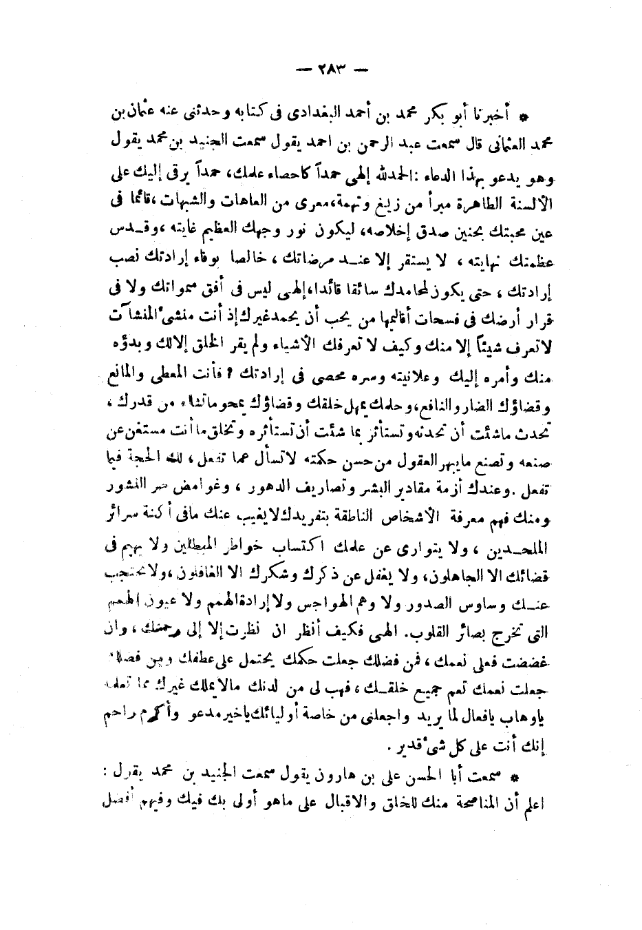 أَخْبَرَنَا أَبُو بَكْرٍ مُحَمَّدُ بْنُ أَحْمَدَ الْبَغْدَادِيُّ فِي كِتَابِهِ، وَحَدَّثَنِي عَنْهُ عُثْمَانُ بْنُ مُحَمَّدٍ الْعُثْمَانِيُّ قَالَ: سَمِعْتُ عَبْدَ الرَّحْمَنِ بْنَ أَحْمَدَ، يَقُولُ: سَمِعْتُ الْجُنَيْدَ بْنَ مُحَمَّدٍ، يَقُولُ وَهُوَ يَدْعُو بِهَذَا الدُّعَاءِ: «§الْحَمْدَ لِلَّهِ إِلَهِي حَمْدًا كَإِحْصَاءِ عِلْمِكَ حَمْدًا يَرْقَى إِلَيْكَ عَلَى الْأَلْسِنَةِ الطَّاهِرَةِ مُبَرَّأً مِنْ كُلِّ زَيْغٍ وَتُهْمَةٍ مُعَرًّى مِنِ الْعَاهَاتِ وَالشُّبُهَاتِ قَائِمًا فِي عَيْنِ مَحَبَّتِكَ بِحَنِينِ صِدْقِ إِخْلَاصِهِ لِيَكُونَ نُورُ وَجْهِكَ الْعَظِيمِ غَايَتَهُ وَقُدُسَ عَظَمَتِكَ نِهَايَتَهُ لَا يَسْتَقِرُّ إِلَّا عِنْدَ مَرْضَاتِكَ خَالِصًا بِوَفَاءِ إِرَادَتِكَ نُصْبَ إِرَادَتِكَ حَتَّى يَكُونَ لِمَحَامِدِكَ سَائِقًا قَائِدًا، إِلَهِي لَيْسَ فِي أُفُقِ سَمَوَاتِكَ وَلَا فِي قَرَارِ أَرْضِكَ فِي فَسَحَاتِ أَقَالِيمِهَا مَنْ يُحِبِّ أَنْ يَحْمَدَ غَيْرَكَ إِذْ أَنْتَ مُنْشِئُ الْمُنْشَآتِ لَا تَعْرِفُ شَيْئًا إِلَّا مِنْكَ، وَكَيْفَ لَا تَعْرِفُكَ الْأَشْيَاءُ وَلَمْ يُقِرَّ الْخَلْقُ إِلَّا لَكَ وَبَدْؤُهُ مِنْكَ وَأَمْرُهُ إِلَيْكَ وَعَلَانِيَتُهُ وَسَرُّهُ مُحْصًي فِي إِرَادَتِكَ فَأَنْتَ الْمُعْطِي وَالْمَانِعُ وَقَضَاؤُكَ الضَّارُّ وَالنَّافِعُ وَحِلْمُكَ يُمْهِلُ خَلْقَكَ، وَقَضَاؤُكَ يَمْحُو مَا تَشَاءُ مِنْ قَدَرِكَ تُحْدِثُ مَا شِئْتَ أَنْ تُحْدِثَهُ وَتَسْتَأْثِرُ بِمَا شِئْتَ أَنْ تَسْتَأْثِرَهَ، وَتَخْلُقُ مَا أَنْتَ مُسْتَغْنٍ عَنْ صُنْعِهِ، وَتَصْنَعُ مَا يَبْهَرُ الْعُقُولَ مِنْ حُسْنِ حِكْمَتِهِ لَا تُسْأَلُ عَمَّا تَفْعَلُ لَكَ الْحُجَّةُ فِيمَا تَفْعَلُ، وَعِنْدَكَ أَزِمَّةُ مَقَادِيرِ الْبَشَرِ وَتَصَارِيفِ الدُّهُورِ وَغَوَامِضِ سِرِّ النُّشُورِ، وَمِنْكَ فَهْمُ مَعْرِفَةِ الْأَشْخَاصِ النَّاطِقَةِ بِتَفَرِّيدِكَ لَا يَغِيبُ عَنْكَ مَا فِي أَكِنَّةِ سَرَائِرِ الْمُلْحِدِينَ وَلَا يَتَوَارَى عَنْ عِلْمِكَ اكْتِسَابُ خَوَاطِرِ الْمُبْطِلِينَ وَلَا يَهِيمُ فِي قَضَائِكَ إِلَّا الْجَاهِلُونَ وَلَا يَغْفُلُ عَنْ ذِكْرِكَ وَشُكْرِكَ إِلَّا الْغَافِلُونَ، وَلَا تَحْتَجِبُ عَنْكَ وَسَاوِسُ الصُّدُورِ وَلَا وَهْمُ الْهَوَاجِسِ، وَلَا إِرَادَةُ الْهِمَمِ وَلَا عُيونُ الْهِمَمِ الَّتِي تُخْرِجُ بَصَائِرَ الْقُلُوبِ، إِلَهِي فَكَيْفَ أَنْظُرُ إِنْ نَظَرْتُ إِلَّا إِلَى رَحْمَتِكَ؟ وَإِنْ غَضَضْتَ فَعَلَيَّ نِعَمُكَ، فَمِنْ فَضْلِكَ جَعَلْتَ حُكْمَكَ يَحْتَمِلُ عَلَى عَطْفِكَ وَمْنِ فَضْلِكَ جَعَلْتَ نِعَمَكَ تَعُمُّ جَمِيعَ خَلْقِكَ فَهَبْ لِي مِنْ لَدُنْكَ مَا لَا يَمْلِكُ غَيْرُكَ مِمَّا تَعْلَمُهُ يَا وَهَّابُ يَا فَعَّالُ لِمَا يُرِيدُ، وَاجْعَلْنِي مِنْ خَاصَّةِ أَوْلِيَائِكِ يَا خَيْرَ مَدْعُوٍّ وَأَكْرَمَ رَاحِمٍ إِنَّكَ أَنْتَ عَلَى كُلِّ شَيْءٍ قَدِيرٌ»