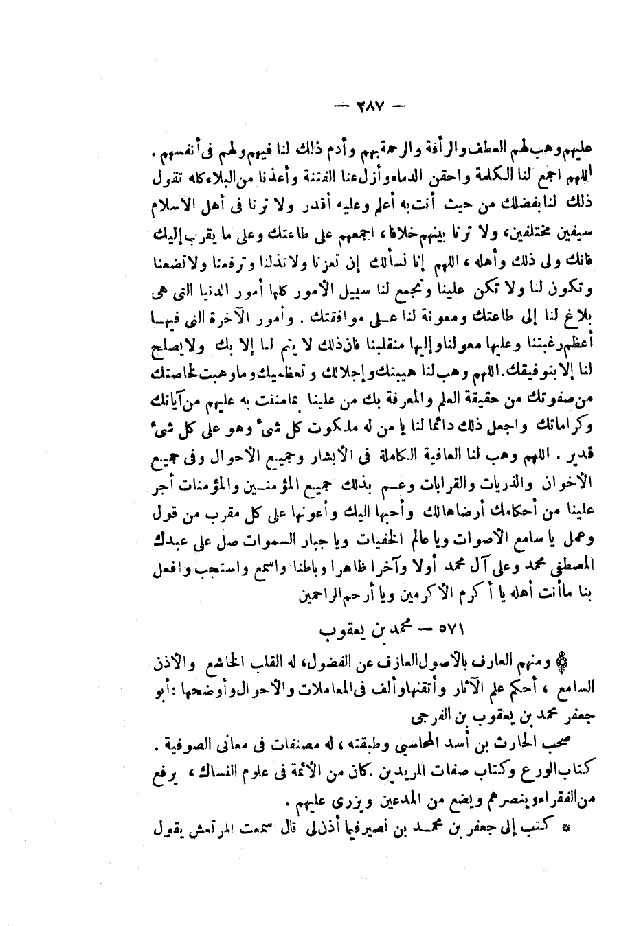 §مُحَمَّدُ بْنُ يَعْقُوبَ وَمِنْهُمُ الْعَارِفُ بِالْأُصُولِ الْعَازِفُ عَنِ الْفُضُولِ لَهُ الْقَلْبُ الْخَاشِعُ وَالْأُذُنُ السَّامِعُ أَحْكَمَ عِلْمَ الْآثَارِ وَأَتْقَنَهَا وَأَلَّفَ فِي الْمُعَامَلَاتِ وَالْأَحْوَالِ وَأَوْضَحَهَا أَبُو جَعْفَرٍ مُحَمَّدُ بْنُ يَعْقُوبَ بْنِ الْفَرَجِيُّ صَحِبَ الْحَارِثَ بْنَ أَسَدٍ الْمُحَاسِبِيَّ وَطَبَقَتَهُ، لَهُ مُصَنَّفَاتٌ فِي مَعَانِي الصُّوفِيَّةِ، (كِتَابُ الْوَرَعِ) (وَكِتَابُ صِفَاتِ الْمُرِيدِينَ) كَانَ مِنَ الْأَئِمَّةِ فِي عُلُومِ النُّسَّاكِ يَرْفَعُ مِنَ الْفُقَرَاءِ وَيَنْصُرُهُمْ وَيَضَعُ مِنَ الْمُدَّعِينَ وَيُزْرِي عَلَيْهِمْ