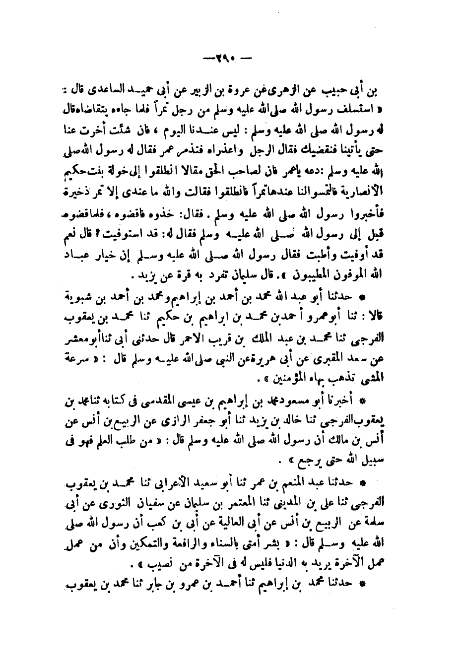 أَخْبَرَنَا أَبُو مَسْعُودٍ مُحَمَّدُ بْنُ إِبْرَاهِيمَ بْنِ عِيسَى الْمَقْدِسِيُّ فِي كِتَابِهِ، ثنا مُحَمَّدُ بْنُ يَعْقُوبَ الْفَرَجِيُّ، ثنا خَالِدُ بْنُ يَزِيدَ، ثنا أَبُو جَعْفَرٍ الرَّازِيُّ، عَنِ الرَّبِيعِ بْنِ أَنَسٍ، عَنْ أَنَسِ بْنِ مَالِكٍ، أَنَّ رَسُولَ اللَّهِ صَلَّى اللهُ عَلَيْهِ وَسَلَّمَ قَالَ: «§مَنْ طَلَبَ الْعِلْمَ فَهُوَ فِي سَبِيلُ اللَّهُ حَتَّى يَرْجِعَ»