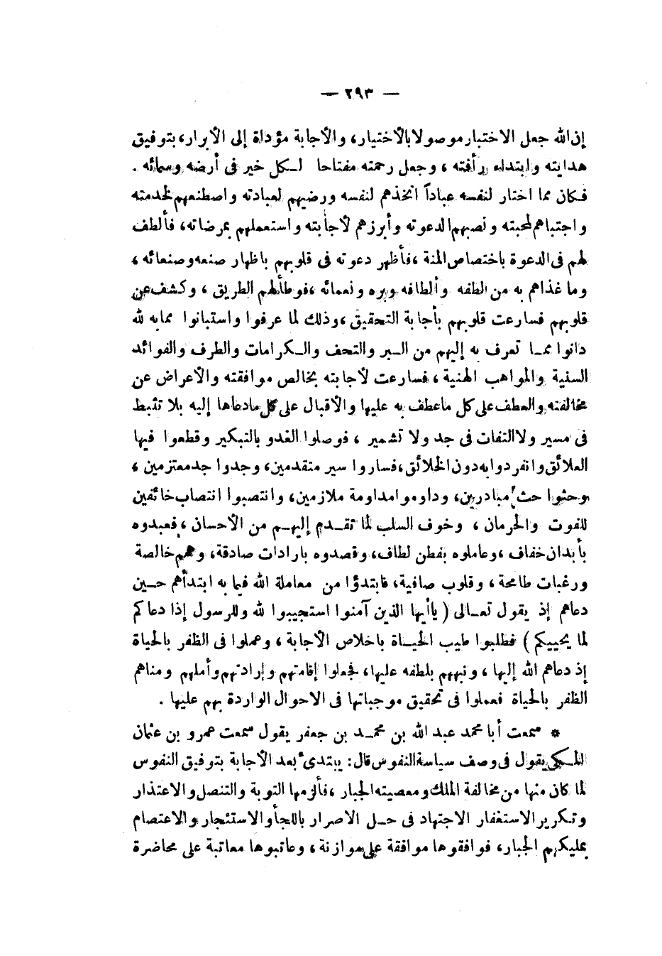 سَمِعْتُ أَبَا مُحَمَّدِ عَبْدَ اللَّهِ بْنَ مُحَمَّدِ بْنِ جَعْفَرٍ، يَقُولُ: سَمِعْتُ عَمْرَو بْنَ عُثْمَانَ الْمَكِّيَّ، يَقُولُ فِي وَصْفِ سِيَاسَةِ النُّفُوسِ قَالَ: " §يَبْتَدِئُ بَعْدَ الْإِجَابَةِ بِتَوْفِيقِ النُّفُوسِ لِمَا كَانَ مِنْهَا مِنْ مُخَالَفَةِ الْمَلِكِ وَمَعْصِيَةَ الْجَبَّارِ فَأَلْزَمَهَا التَّوْبَةَ وَالتَنَصُّلَ وَالِاعْتِذَارَ وَتَكْرِيرَ الِاسْتِغْفَارِ، وَالِاجْتِهَادَ فِي حَلِّ الْإِصْرَارِ بِاللَّجَأَ وَالِاسْتِئْجَارِ وَالِاعْتِصَامِ بِمَلِيكِهِمُ الْجَبَّارِ فَوَافَقُوهَا مُوَافَقَةً عَلَى مَوَازَنَةٍ وَعَاتَبُوهَا مُعَاتَبَةً عَلَى مُحَاضَرَةٍ -[294]- وَوَبَّخُوهَا بِمَا فَرَطَ مِنْهَا مِنَ الْجَهْلِ وَالتَّضْيِيعِ وَالشُّرُورِ وَالتَّمَادِي وَالتَّمَرُّدِ فِي رُكُوبِ الْمَعَاصِي فَوَبَّخُوهَا بَيْنَ يَدَيْهِ وَعَاتَبُوهَا مُعَاتَبَةَ مَنْ قَدْ عَرَضَ عَلَيْهِ وَقَرَّرُوهَا تَقْرِيرَ مُنَاقَشَةِ الْحِسَابِ وَجَرَّعُوهَا مَا تَوَعَّدَهُ اللَّهُ مِنْ أَلِيمِ الْعَذَابِ وَشَدِيدِ الْعِقَابِ ثُمَّ أَقَامُوهَا مَقَامَ الْخِزْيِ فَأَبْدَلُوهَا بِحَالِ الرَّفَاهَاتِ الْقَشَفَ وَالتَّقَشُّفَ وَالضُّرَ وَالتَّخَفُّفَ، فَأَبْدَلُوهَا بِالشِّبَعِ جُوعًا وَبِالنَّوْمِ سَهَرًا وَبِالرَّاحَةِ تَعَبًا وَبِالْقُعُودِ نَصَبًا وَبِطَيِّبِ الْمَطَاعِمِ الْخَبِيثَ الْخَشِنَ، وَبِلِينِ الْمَلَابِسِ الْخَشِنَ الْجَافِي وَبِأَمْنِ الْوَطَنِ خَوْفَ الْبَيَاتِ، ثُمَّ أَزْعَجُوهَا عَنْ تَوَطُّنِ مَا بِهِ أَلْزَمُوهَا فَمَنَعُوهَا اسْتِوَاءَ الْأَوْقَاتِ فِي بَذْلِ الِاجْتِهَادِ وَأَخَذُوهَا بِدَائِمِ الِازْدِيَادِ عَلَى سَبِيلِ الْمُوَازَنَةِ وَأَقَامُوهَا مَقَامَ التَّصَفُّحِ وَالتَّفْتِيشِ وَالْمُحَاسَبَةِ وَالتَّوْقِيفِ عَلَى كُلِّ لَحْظَةٍ وَخَطْرَةٍ وَهَمَّةٍ وَلَفْظَةٍ وَفِكْرَةٍ وَأُمْنِيَةٍ وَشَهْوَةٍ وَإِرَادَةٍ وَمَحَبَّةٍ فَهَكَذَا أَبَدًا دَأْبُهُمْ وَفِي هَذِهِ أَبَدًا حَالُهُمْ عَلَى هَذِهِ السَّيَاسَةِ بِشَرْطِ هَذِهِ الْمُجَاهَدَةِ وَانْتِصَابِ هَذِهِ الْمُكَابَدَةِ وَإِحَاطَةِ هَذِهِ الْمُرَاوَضَةِ، وَمَعَ هَذَا فَالْهَرَبُ إِلَى اللَّهِ فِيهَا وَالِاعْتِضَادُ بِاللَّهِ عَلَيْهَا وَالتَّأَوِّي إِلَى اللَّهِ مِنْهَا وَالِاسْتِعَاذَةُ بِاللَّهِ مِنْ شَرِّهَا، وَالِاسْتِعَانَةُ بِاللَّهِ عَلَى كَيْدِهَا وَالصُّرَاخِ إِلَى اللَّهِ عِنْدَ شُرُودِهَا، وَاسْتَغْثِ بِالْمَلِكِ الْأَعْلَى الَّذِي هُوَ صَرِيخُ الْأَخْيَارِ وَمُنَجِّي الْأَبْرَارِ وَمُلْتَجَأُ الْمُتَّقِينَ وَنَاصِرُ الصَّالِحِينَ؛ لِأَنَّ اللَّهَ تَعَالَى إِذَا شَكَرَ لِوَلِيِّهِ عَظِيمَ مَا جَاهَدَ وَجَسِيمَ مَا كَابَدَ وَمَشَقَّةَ مَا احْتَمَلَ وَجَهْدَ مَا انْتَصَبَ تَوَلَّاهُ بِالنُّصْرَةِ وَالتَّأْيِيدِ وَالْعِزِّ وَالتَّأْيِيدِ، وَمَنْ نَصَرَهُ لَمْ يُخْذَلْ وَمَنْ أَعَزَّهُ لَمْ يُقْهَرْ وَمَنْ تَوَلَّاهُ لَمْ يُذَلَّ، فَرَوَّحَهَا رَوْحَ الْيَقِينِ وَأَضَاءَ لَهَا عَلَامَاتِ التَّصْدِيقِ مِنَ اللَّهِ بِالْقَبُولِ وَأَنَارَتْ لَهَا عَلَامَاتُ التَّحْقِيقِ وَتَوَالَتْ عَلَيْهَا مُدَاوَمَةُ الْمَزِيدِ وَعَادَتْ عَلَيْهَا تِكْرَارُ التُّحَفِ وَالْبِرِّ وَالْكَرَامَاتِ، وَعَطَفَتْ عَلَيْهَا عَوَاطِفُ الْفَضْلِ بِالرَّحْمَةِ وَالْبَذْلِ؛ لِأَنَّ اللَّهَ تَعَالَى الْمُبْتَدِئُ عَبْدَهُ بِمَا ابْتَدَأَ بِهِ الْعَبْدُ مِنْ بَذْلٍ فِي قُرْبَةٍ أَوْ مِنَ اجْتِهَادٍ فِي وَسِيلَةٍ أَوْ مِنْ مُنَافَسَةٍ فِي فَضِيلَةٍ أَوْ مِنْ مُسَارَعَةٍ إِلَى خِدْمَةٍ أَوْ مِنْ إِخْلَاصٍ فِي نِيَّةٍ أَوْ مِنْ تَكَامُلٍ فِي رَغْبَةٍ أَوْ مِنْ تَحْقِي