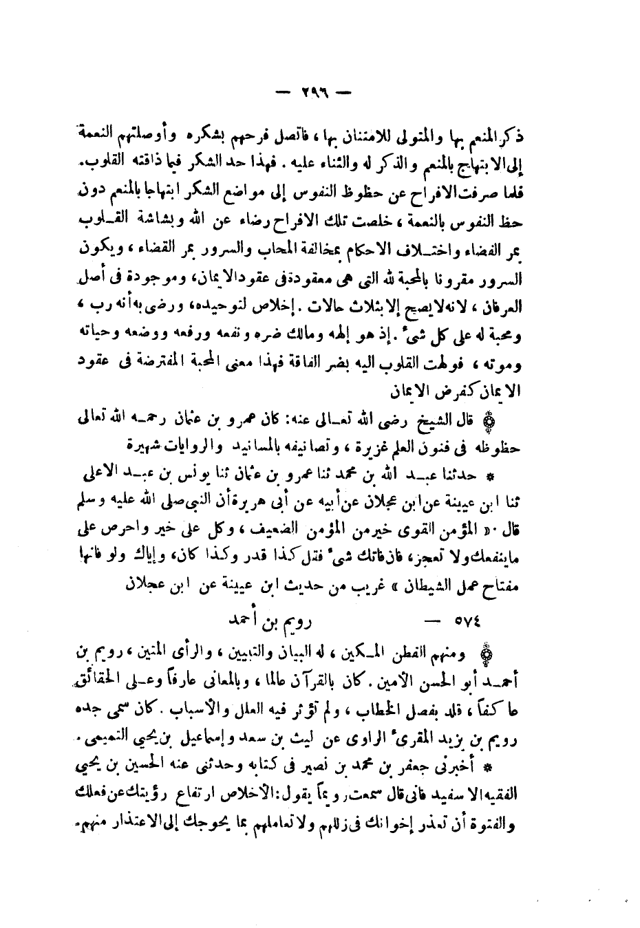 أَخْبَرَنِي جَعْفَرُ بْنُ مُحَمَّدِ بْنِ نُصَيْرٍ، فِي كِتَابِهِ , وَحَدَّثَنِي عَنْهُ الْحُسَيْنُ بْنُ يَحْيَى الْفَقِيهُ الْأَسْفِيدَفَانِيُّ قَالَ: سَمِعْتُ رُوَيْمًا يَقُولُ: «§الْإِخْلَاصُ ارْتِفَاعُ رُؤْيَتِكَ عَنْ فِعْلِكَ، وَالْفُتُوَّةُ، أَنْ تَعْذُرَ إِخْوَانَكَ فِي زَلَلِهِمْ وَلَا تُعَامِلَهُمْ بِمَا يُحْوِجُكَ إِلَى الِاعْتِذَارِ مِنْهُمْ»