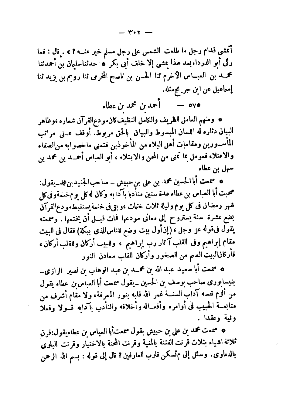 سَمِعْتُ أَبَا سَعِيدٍ عَبْدَ اللَّهِ بْنَ مُحَمَّدِ بْنِ عَبْدِ الْوَهَّابِ بْنِ نُصَيْرٍ الرَّازِيَّ، بِنَيْسَابُورَ صَاحِبُ يُوسُفَ بْنِ الْحُسَيْنِ يَقُولُ: سَمِعْتُ أَبَا الْعَبَّاسِ بْنَ عَطَاءٍ، يَقُولُ: «§مَنْ أَلْزَمَ نَفْسَهُ آدَابَ السُّنَّةِ غَمَرَ اللَّهُ قَلْبَهُ بِنُورِ الْمَعْرِفَةِ، وَلَا مَقَامَ أَشْرَفُ مِنْ مُتَابَعَةِ الْحَبِيبِ فِي أَوَامِرِهِ وَأَفْعَالِهِ وَأَخْلَاقِهِ وَالتَّأَدُّبِ بِآدَابِهِ قَوْلًا وَفِعْلًا وَنِيَّةً وَعَقْدًا»