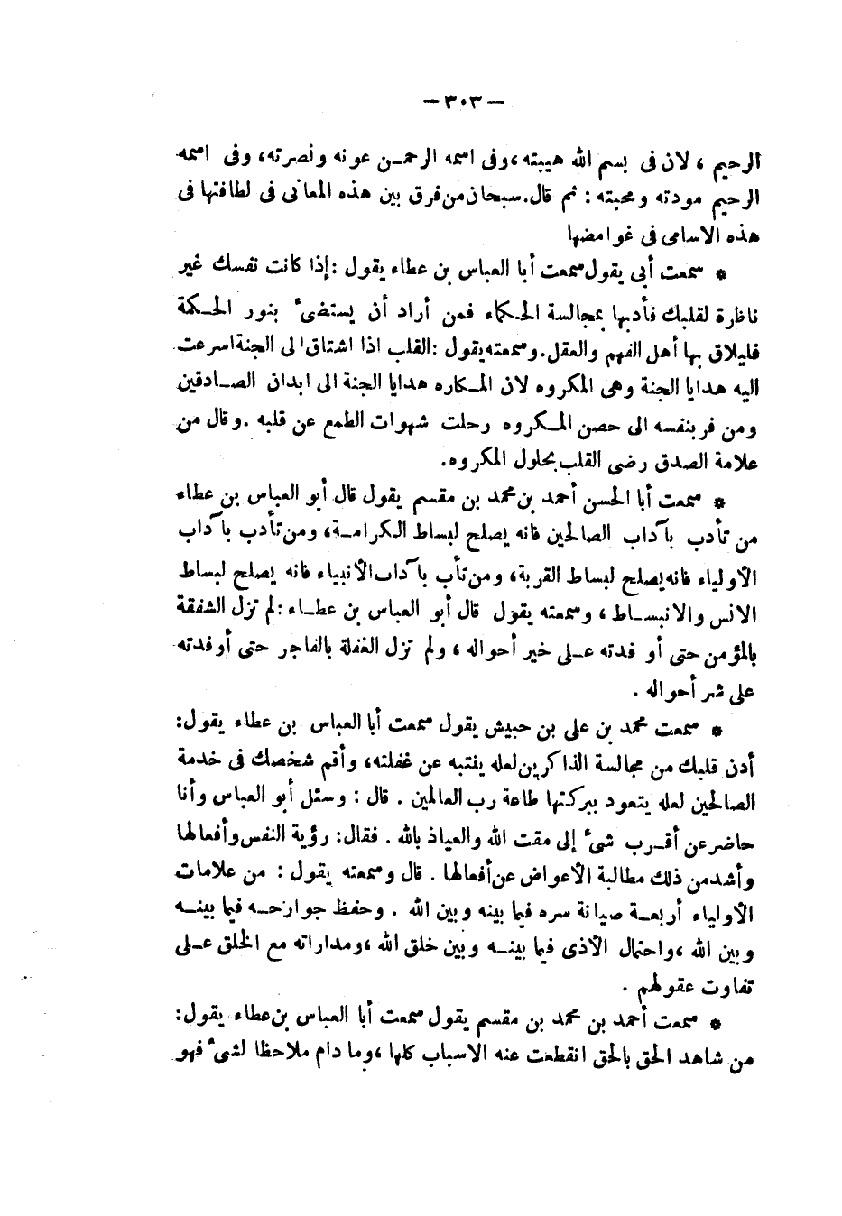 سَمِعْتُ أَبِي يَقُولُ: سَمِعْتُ أَبَا الْعَبَّاسِ بْنَ عَطَاءٍ، يَقُولُ: " §إِذَا كَانَتْ نَفْسُكَ غَيْرَ نَاظِرَةٍ لِقَلْبِكَ فَأَدِّبْهَا بِمُجَالَسَةِ الْحُكَمَاءِ فَمَنْ أَرَادَ أَنْ يَسْتَضِيءَ بِنُورِ الْحِكْمَةِ فَلْيُلَاقِ بِهَا أَهْلَ الْفَهْمِ وَالْعَقْلِ، وَسَمِعْتُهُ يَقُولُ: الْقَلْبُ إِذَا اشْتَاقَ إِلَى الْجَنَّةِ أَسْرَعَتْ إِلَيْهِ هَدَايَا الْجَنَّةِ وَهِيَ الْمَكْرُوهُ؛ لِأَنَّ الْمَكَارِهَ هَدَايَا الْجَنَّةِ إِلَى أَبْدَانِ الصَّادِقِينَ وَمَنْ فَرَّ بِنَفْسِهِ إِلَى حِصْنِ الْمَكْرُوهِ رَحَلَتْ شَهَوَاتُ الطَّمَعِ عَنْ قَلْبِهِ، وَقَالَ: مِنْ عَلَامَةِ الصِّدْقِ رِضَا الْقَلْبِ بِحُلُولِ الْمَكْرُوهِ "