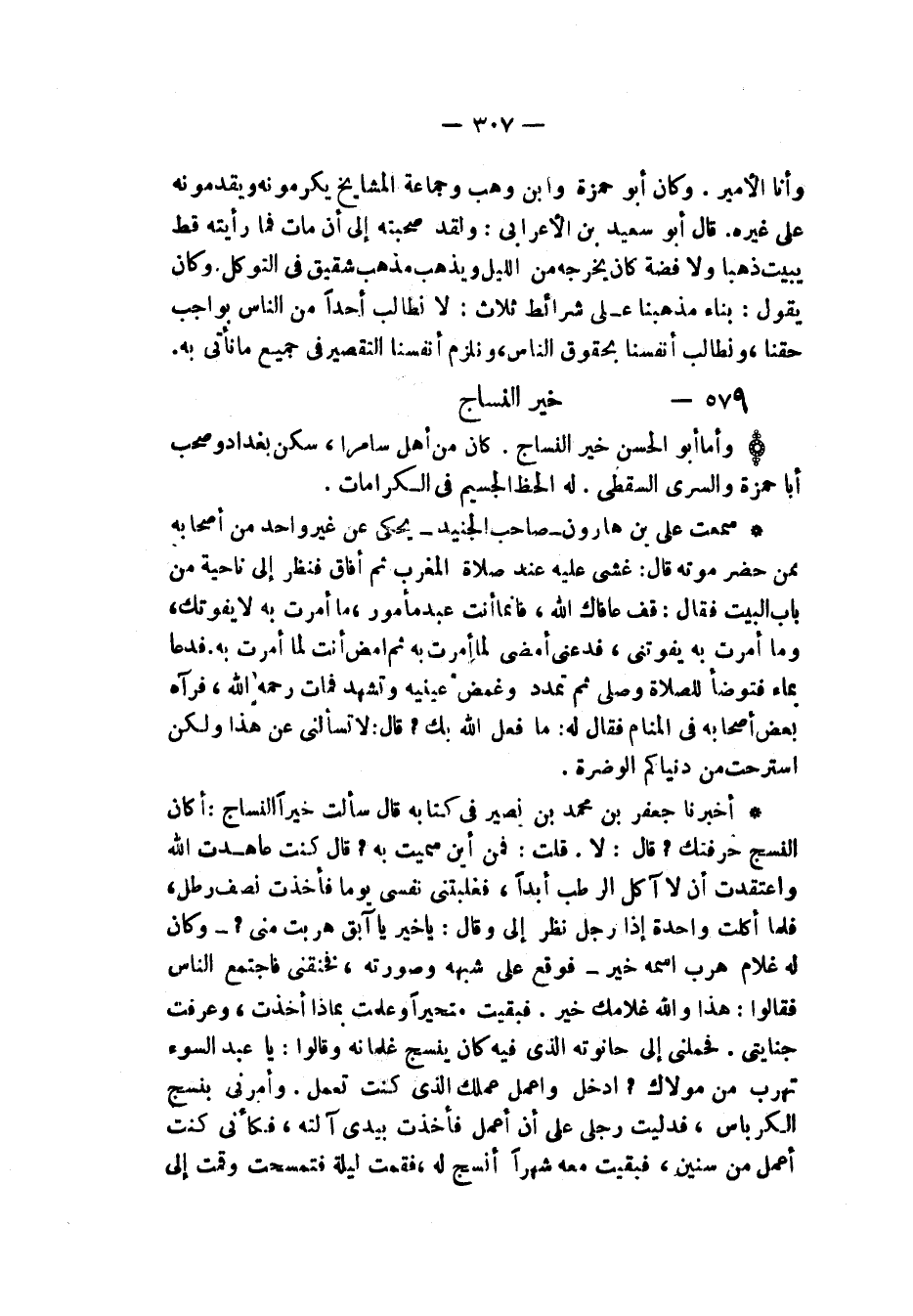 §خَيْرٌ النَّسَّاجُ وَأَمَّا أَبُو الْحَسَنِ خَيْرٌ النَّسَّاجُ، كَانَ مِنْ أَهْلِ سَامَرَّاءَ سَكَنَ بَغْدَادَ وَصَحِبَ أَبَا حَمْزَةَ، وَالسَّرِيَّ السَّقَطِيَّ، لَهُ الْحَظُّ الْجَسِيمُ فِي الْكَرَامَاتِ