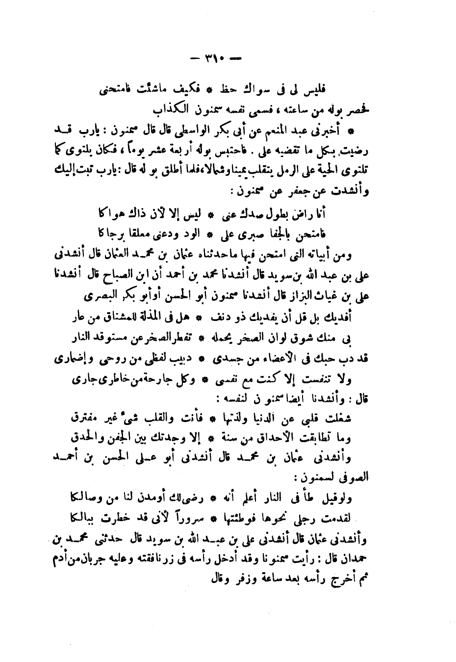 وَأَنْشَدَنِي عُثْمَانُ بْنُ مُحَمَّدٍ قَالَ: أَنْشَدَنِي أَبُو الْحَسَنِ بْنُ أَحْمَدَ الصُّوفِيُّ لِسَمْنُونٍ: