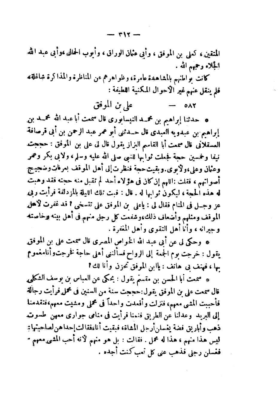 سَمِعْتُ أَبَا الْحَسَنِ بْنَ مِقْسَمٍ، يَقُولُ: يُحْكَى عَنِ الْعَبَّاسِ بْنِ يُوسُفِ الشِّكْلِيِّ قَالَ: سَمِعْتُ عَلِيَّ بْنَ الْمُوَفَّقِ، يَقُولُ: " §حَجَجْتُ سَنَةً مِنَ السِّنِينَ فِي مَحْمَلٍ فَرَأَيْتُ رَجَّالَةً فَأَحْبَبْتُ الْمَشْيَ مَعَهُمْ فَنَزَلْتُ وَأَقْعَدْتُ وَاحِدًا فِي مَحْمَلِي وَمَشَيْتُ مَعَهُمْ فَتَقَدَّمْنَا إِلَى الْبَرِيدِ وَعَدَلْنَا عَنِ الطَّرِيقِ فَنِمْنَا فَرَأَيْتُ فِي مَنَامِي جَوَارِيَ مَعَهُنَّ طُسُوتُ ذَهَبَ وَأَبَارِيقُ فِضَّةٍ يَغْسِلْنَ أَرْجُلَ الْمُشَاةِ فَبَقِيتُ أَنَا فَقَالَتْ إِحْدَاهُنَّ لِصَاحِبَتِهَا: لَيْسَ هَذَا مِنْهُمْ هَذَا لَهُ مَحْمَلٌ، فَقَالَتْ: بَلْ هُوَ مِنْهُمْ؛ لِأَنَّهُ أَحَبَّ الْمَشْيَ مَعَهُمْ، فَغَسَلْنَ رِجْلَيَّ فَذَهَبَ عَنِّي كُلُّ تَعَبٍ كُنْتُ أَجِدُهُ "