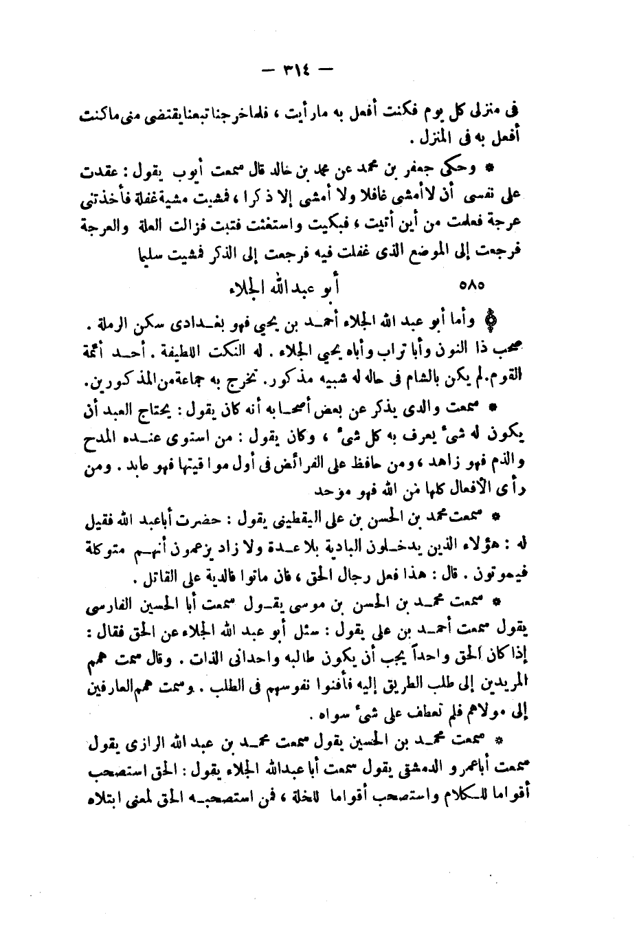 §أَبُو عَبْدِ اللَّهِ الْجَلَّاءُ وَأَمَّا أَبُو عَبْدِ اللَّهِ الْجَلَّاءُ أَحْمَدُ بْنُ يَحْيَى فَهُوَ بَغْدَادِيٌّ سَكَنَ الرَّمْلَةَ، صَحِبَ ذَا النُّونِ وَأَبَا تُرَابٍ، وَأَبَاهُ يَحْيَى الْجَلَّاءِ، لَهُ النُّكَتُ اللَّطِيفَةُ، أَحَدُ أَئِمَّةِ الْقَوْمِ، لَمْ يَكُنْ بِالشَّامِ فِي حَالِهِ لَهُ شَبِيهٌ مَذْكُورٌ، تَخَرَّجَ بِهِ جَمَاعَةٌ مِنَ الْمَذْكُوُرِينَ