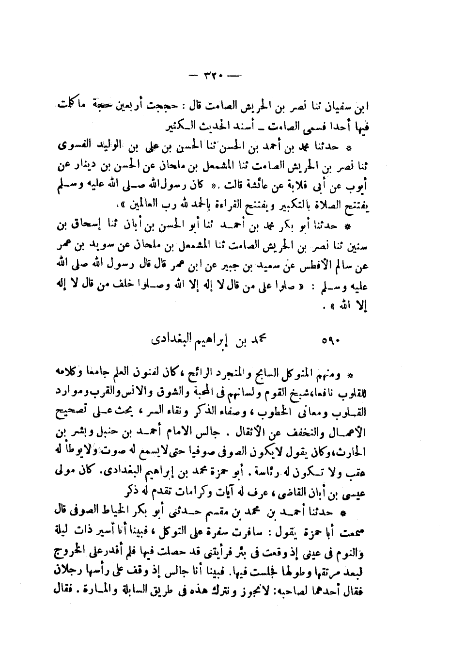 §مُحَمَّدُ بْنُ إِبْرَاهِيمَ الْبَغْدَادِيُّ وَمِنْهُمُ الْمُتَوَكِّلُ السَّابِحُ وَالْمُتَجَرِّدُ الرَّائِحُ كَانَ لِفُنُونِ الْعِلْمِ جَامِعًا وَكَلَامُهُ لِلْقُلُوبِ نَافِعًا شَيْخُ الْقَوْمِ وَلِسَانُهُمْ فِي الْمَحَبَّةِ وَالشَّوْقِ وَالْأُنْسِ وَالْقُرْبِ وَمَوَارِدِ الْقُلُوبِ وَمَعَانِي الْخُطُوبِ وَصَفَاءِ الذِّكْرِ وَنَقَاءِ السِّرِّ يَحُثُّ عَلَى تَصْحِيحِ الْأَعْمَالِ وَالتَّخَفُّفِ عَنِ الْأَثْقَالِ، جَالَسَ الْإِمَامَ أَحْمَدَ بْنَ حَنْبَلٍ وَبِشْرَ بْنَ الْحَارِثِ، وَكَانَ يَقُولُ: لَا يَكُونُ الصُّوفِيُّ صُوفِيًّا حَتَّى لَا يُسْمَعَ لَهُ صَوْتٌ وَلَا يُوطَأُ لَهُ عَقِبٌ وَلَا تَكُونُ لَهُ رِئَاسَةٌ، أَبُو حَمْزَةَ مُحَمَّدُ بْنُ إِبْرَاهِيمَ الْبَغْدَادِيُّ، كَانَ مَوْلَى عِيسَى بْنِ أَبَانَ الْقَاضِي عُرِفَ لَهُ آيَاتٌ وَكَرَامَاتٌ تَقَدَّمُ لَهُ ذِكْرٌ