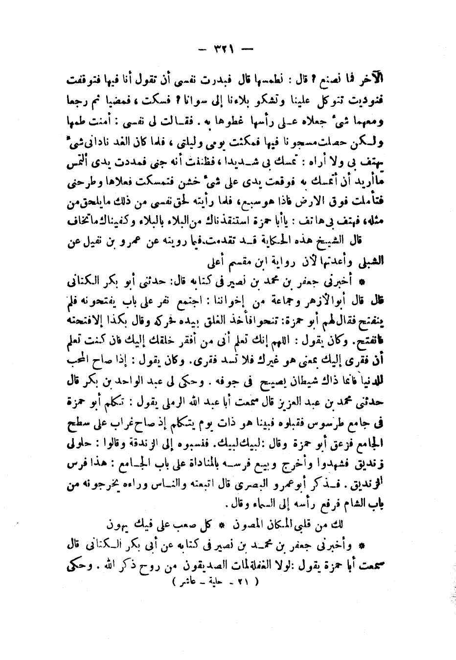 أَخْبَرَنِي جَعْفَرُ بْنُ مُحَمَّدِ بْنِ نُصَيْرٍ، فِي كِتَابِهِ قَالَ: حَدَّثَنِي أَبُو بَكْرٍ الْكَتَّانِيُّ قَالَ: قَالَ أَبُو الْأَزْهَرِ وَجَمَاعَةً مِنْ إِخْوَانِنَا: اجْتَمَعَ نَفَرٌ عَلَى بَابٍ يَفْتَحَونَهُ فَلَمْ يَنْفَتِحْ فَقَالَ لَهُمْ أَبُو حَمْزَةَ: " §تَنَحَّوْا فَأَخَذَ الْغَلَقَ بِيَدِهِ فَحَرَّكَهُ وَقَالَ: بِكَذَا إِلَّا فَتَحْتَهُ فَانْفَتَحَ وَكَانَ يَقُولُ: اللَّهُمَّ إِنَّكَ تَعْلَمُ أَنِّي مِنْ أَفْقَرِ خَلْقِكَ إِلَيْكَ فَإِنْ كُنْتَ تَعْلَمُ أَنَّ فَقْرِي إِلَيْكَ بِمَعْنًى هُوَ غَيْرُكَ فَلَا تَسُدَّ فَقْرِي، وَكَانَ يَقُولُ: إِذَا صَاحَ الْمُحِبُّ لِلدُّنْيَا فَإِنَّمَا ذَاكَ شَيْطَانٌ يَصِيحُ فِي جَوْفِهِ "