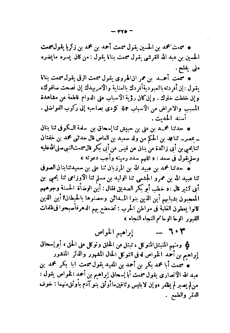 §إِبْرَاهِيمُ الْخَوَّاصُ وَمِنْهُمُ الْمُتَبَتِّلُ الْمُتَوَكِّلُ تَبْتَلَّ عَنِ الْخَلْقِ وَتَوَكَّلَ عَلَى الْحَقِّ أَبُو إِسْحَاقَ إِبْرَاهِيمُ بْنُ أَحْمَدَ الْخَوَّاصُ، لَهُ فِي التَّوَكُّلِ الْحَالُ الْمَشْهُورُ وَالذِّكْرُ الْمَنْشُورِ